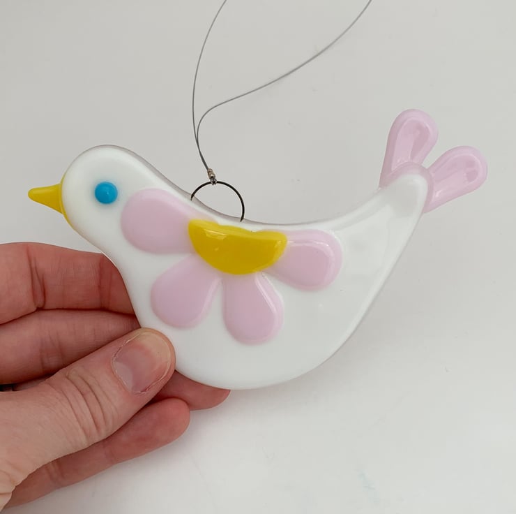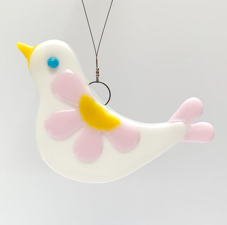 Fused glass hanging bird. Opaque white glass with a pale pink retro flower design. These look lovely hung up somewhere to add a splash of colour.