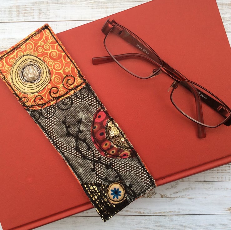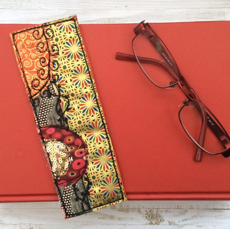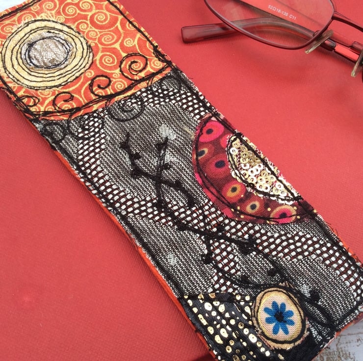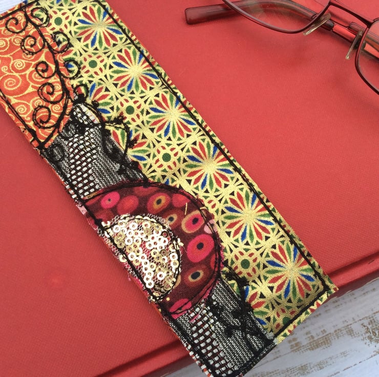 This embroidered gold Klimt style patterned bookmark is made from up-cycled fabric scraps, ribbons and enhanced with free motion embroidery. The bookmark measures 6 x 17cm.