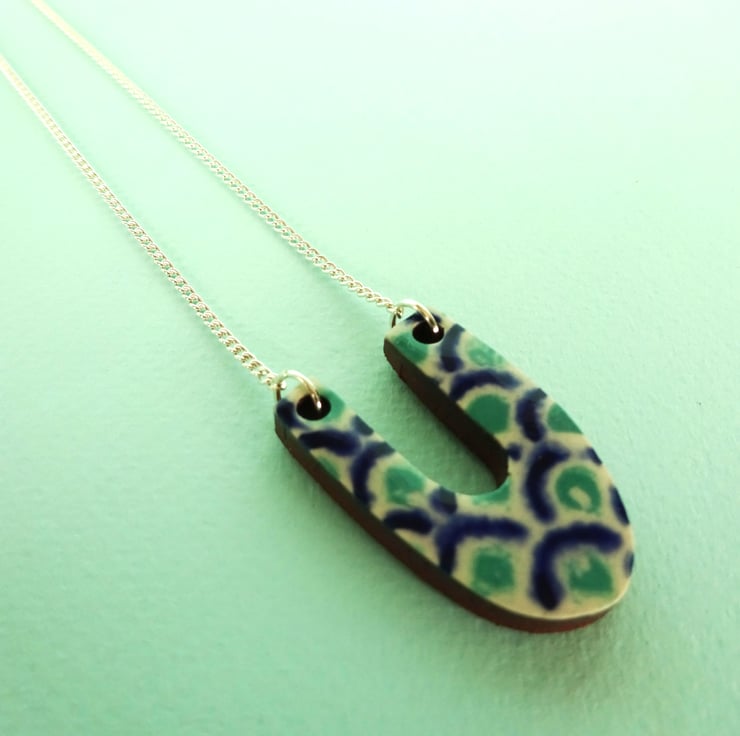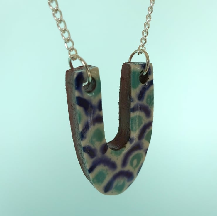 Ceramic U shaped necklace in blue, jade and white suspended on a silver plate curb chain necklace. The pendant is made from an Etruscan terracotta clay and has been printed on the surface using bright coloured under glazes, this is then finished with a clear glaze to make the colours pop. The necklace has a ring clasp.