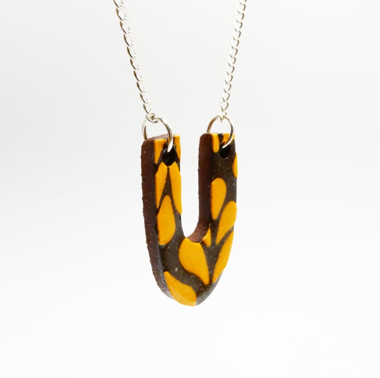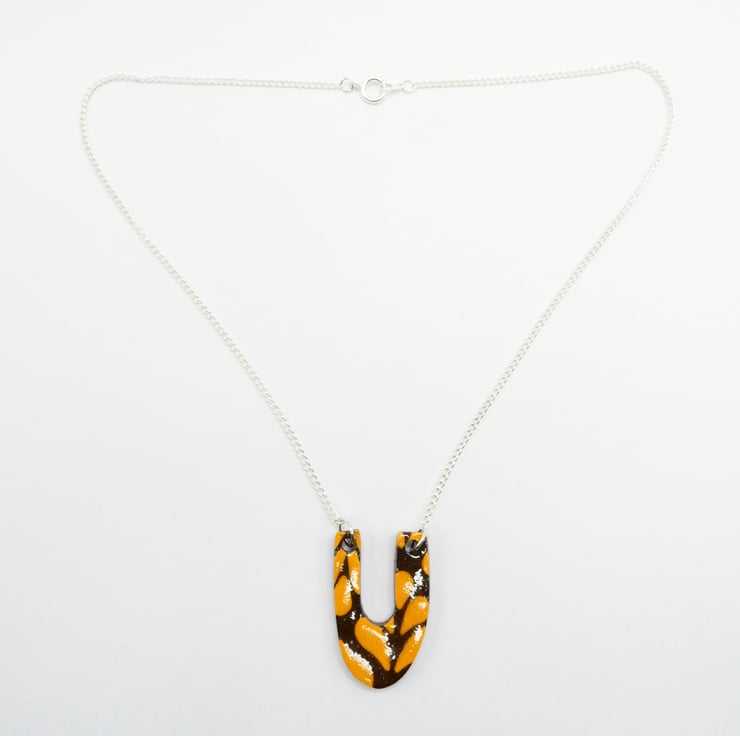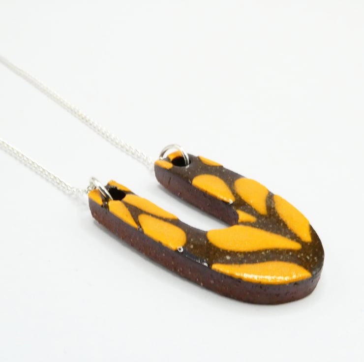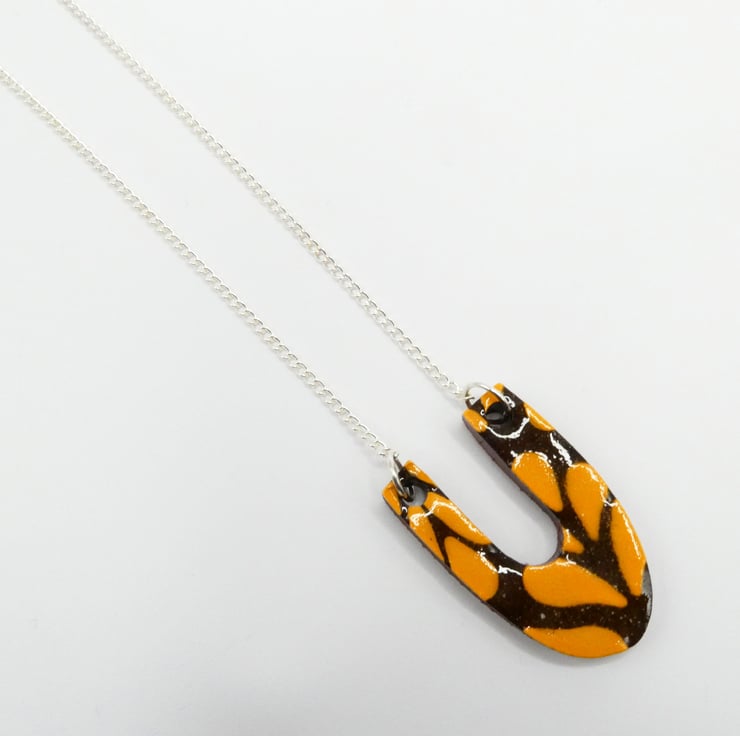 Ceramic U shaped necklace in orange and brown suspended on a silver plate curb chain necklace. The pendant is made from an Etruscan terracotta clay and has been printed on the surface using bright coloured under glazes, this is then finished with a clear glaze to make the colours pop. The necklace has a ring clasp.