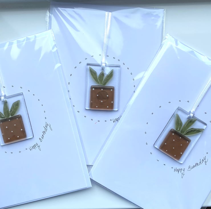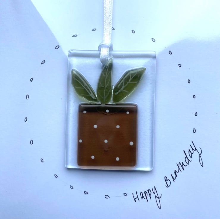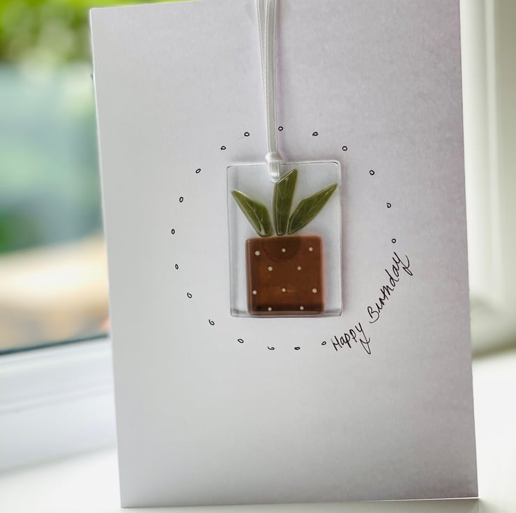 Fused hlass detachable ready to hang glass plant in a pot . Something to keep when the card is no longer needed . A nice gift and a card in one