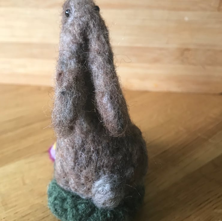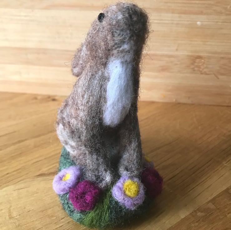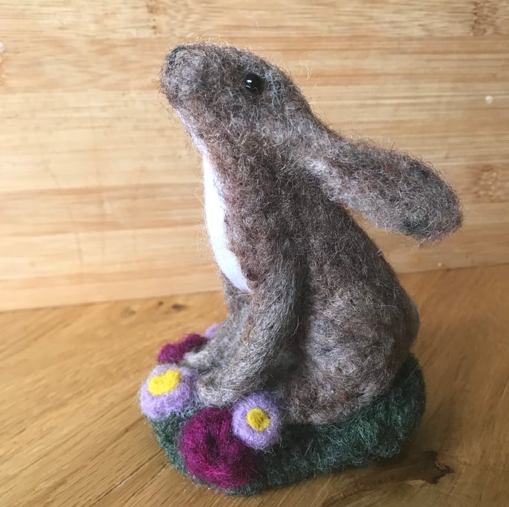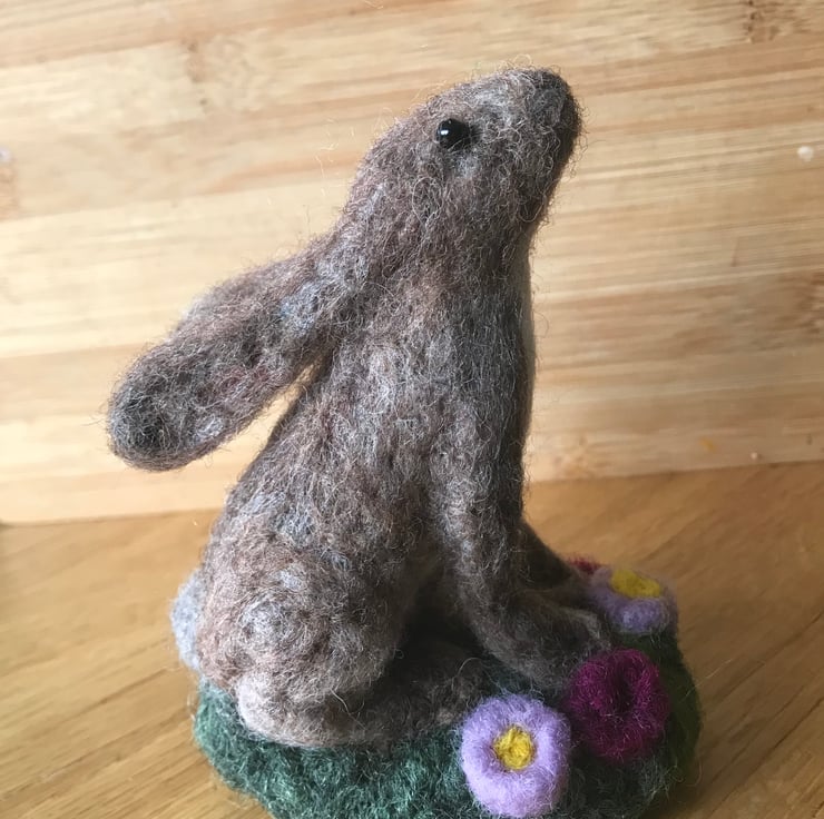 12 cm high from base , sweet baby hare sits among the flowers , Felted base , bead eyes.