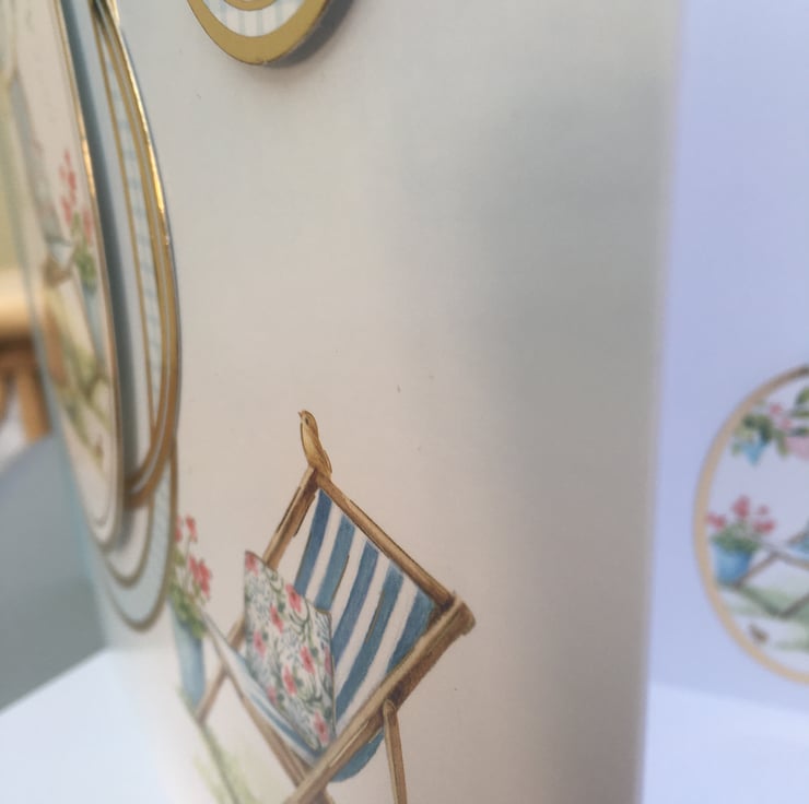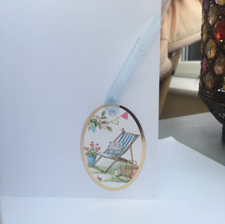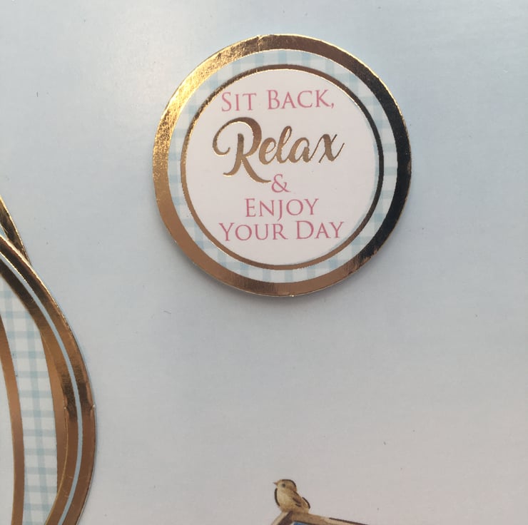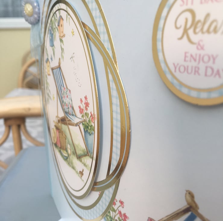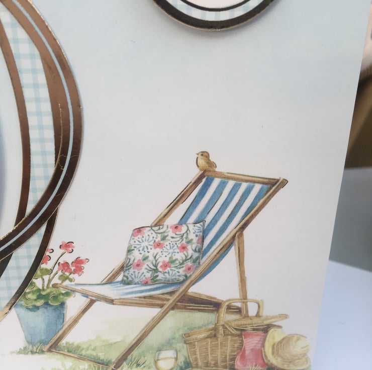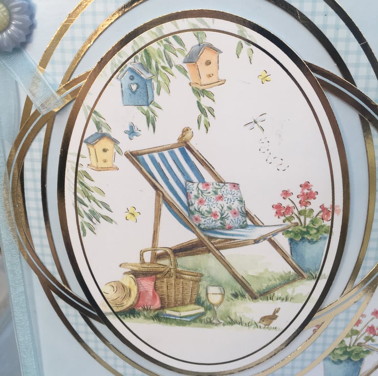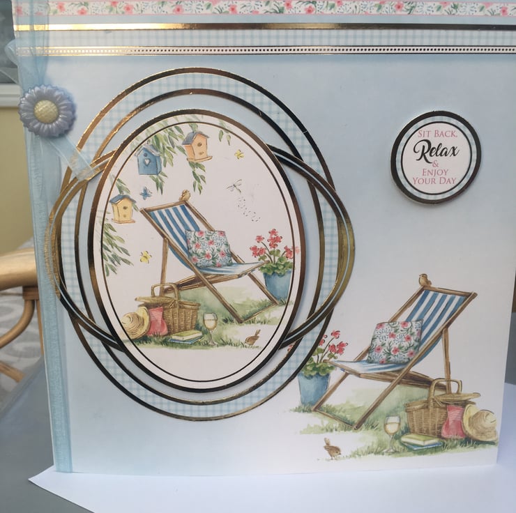 A beautiful summery and fresh card for many occations. This 8x8 inch card features a main image of a deckchair with comfy cushion. It is sitting in a garden surrounded by a picnic basket, flowers, a tree, birds and bird houses. There are 2 gold and blue gingham frames surrounding the image. There is a flower border at the top of the card and an organza ribbon wrapped around the fold. The bow is accented with a blue and yellow daisy button. There is a separate greeting that says 'sit back, relax and enjoy your day. The inside of the card has a matching tag. There is no specific greeting so the card can be used for many occations such as a birthday, anniversary or mother's day.
