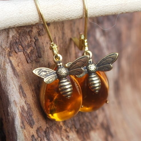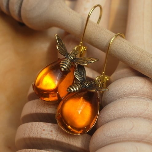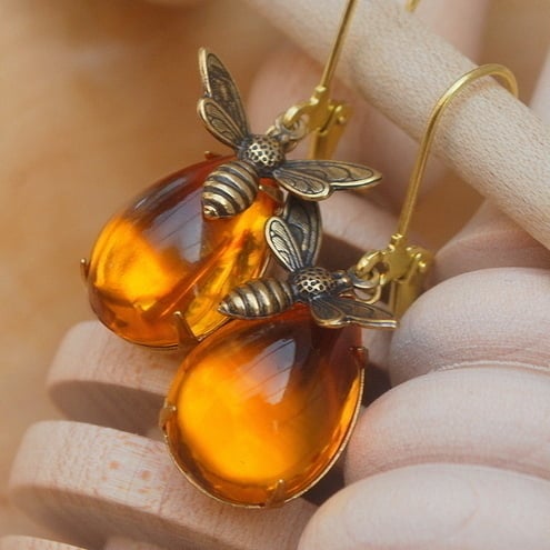 Honey Bee earrings golden amber vintage glass drops of honey.