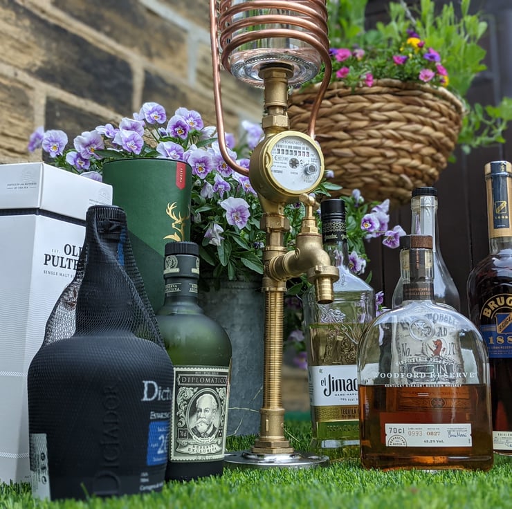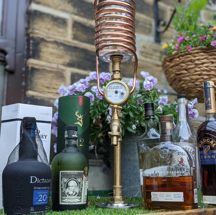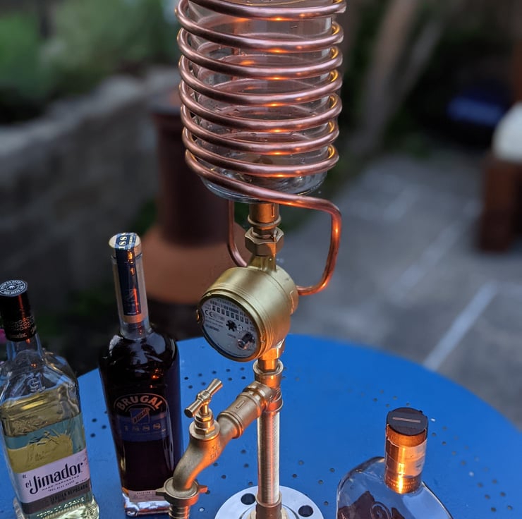 This amazing Liquor dispenser / Lamp is made from the highest quality industrial materials. Starting from the bottom up, the base is a solid stainless steel 316 1 1/4" Flange which keeps the base heavy and thus stable. The Pipework and tap are all brass and safe for water consumption. In the middle of the stem you'll find a fully functioning flow meter which will rotate and clock up in litres how much liquid (Booze ;-D ) has flown through the tap over it's lifetime. You'll find a 0.9L premium thick glass decanter at the top wrapped in 8mm copper tubing with a stainless steel lid to match the base. Inside the lid pointing down you'll also find a remote controlled multi function waterproof LED light which can be set at 16 different colours, a fade between all colours or just left off. the choice is yours!