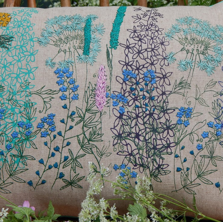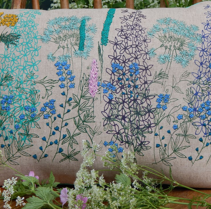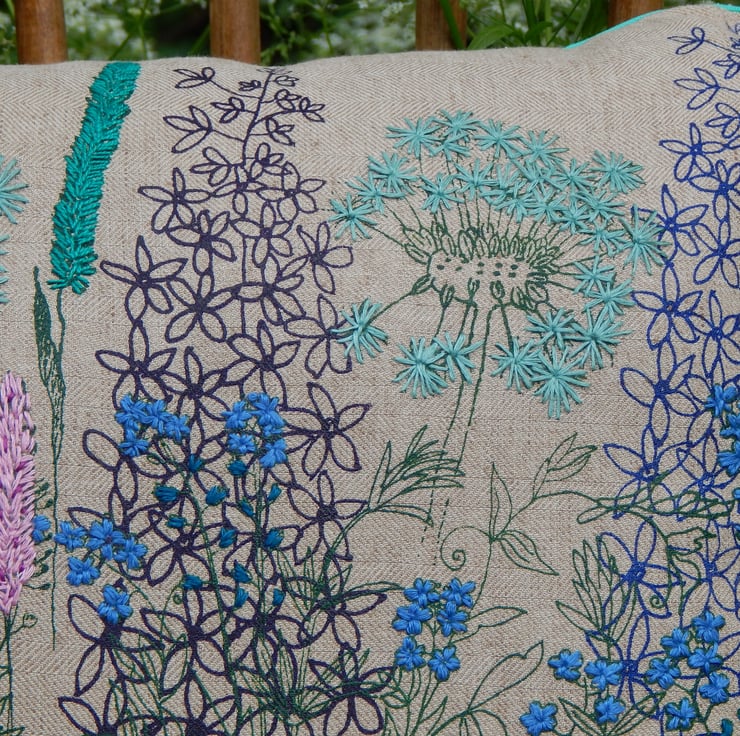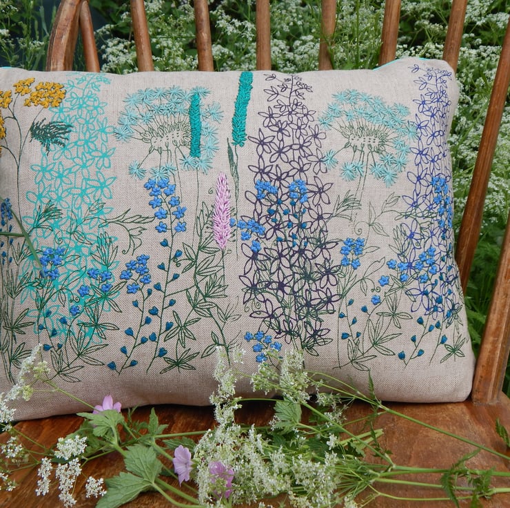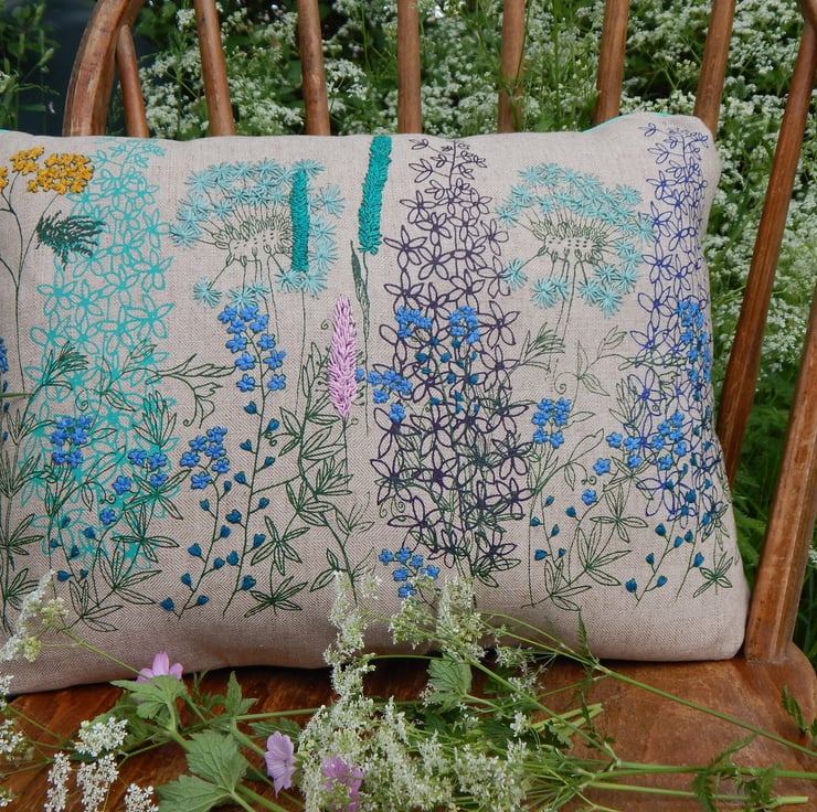 This is a beige cotton/linen cushion that has been screen printed with my own designs. Many have been individually printed which involves positioning, printing an individual flower, drying and then repeating. This gives you an absolutely one off, designed cushion. Almost each flower then is hand embroidered to lift the petals from the fabric and give a pop of life and colour. There are 3 different shades of delphinium. There are dandelion clocks, forget me nots, yarrow and hoary plantain.