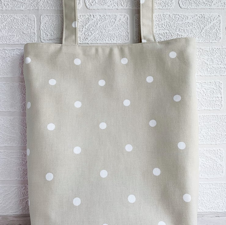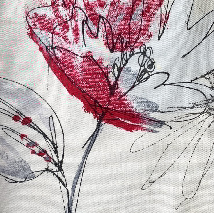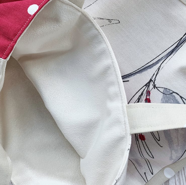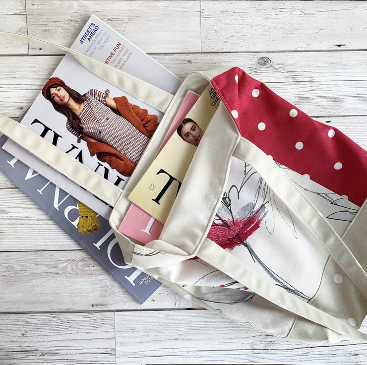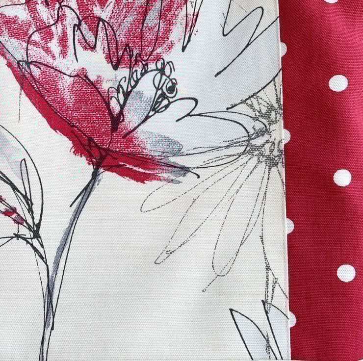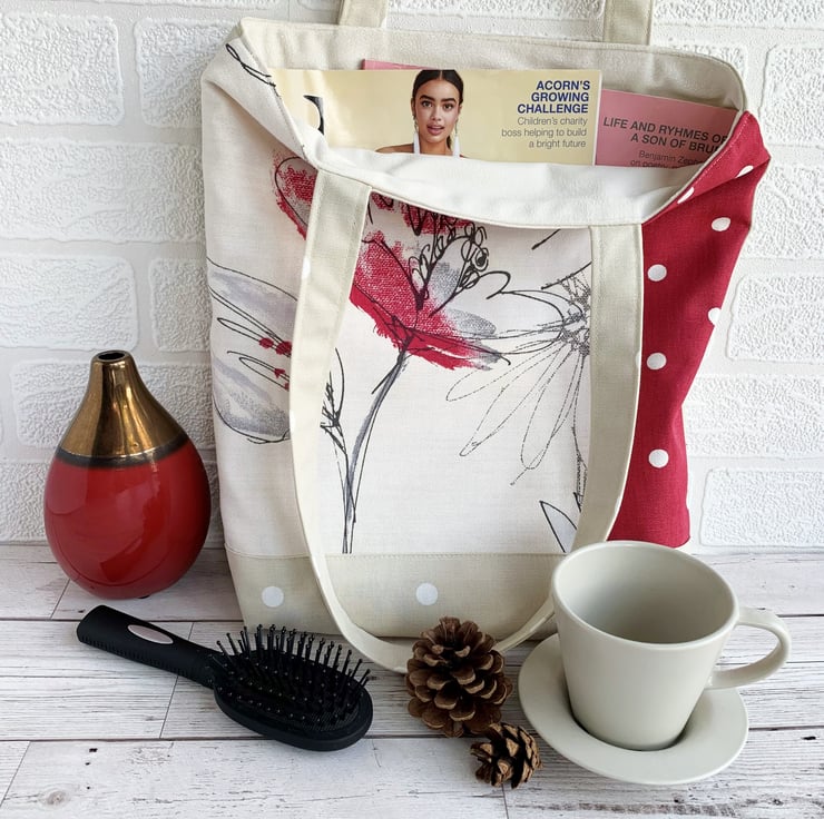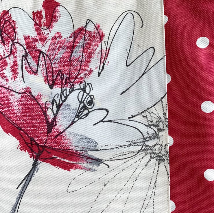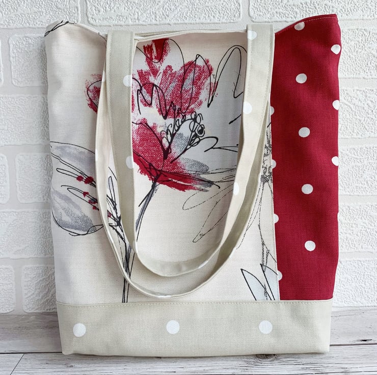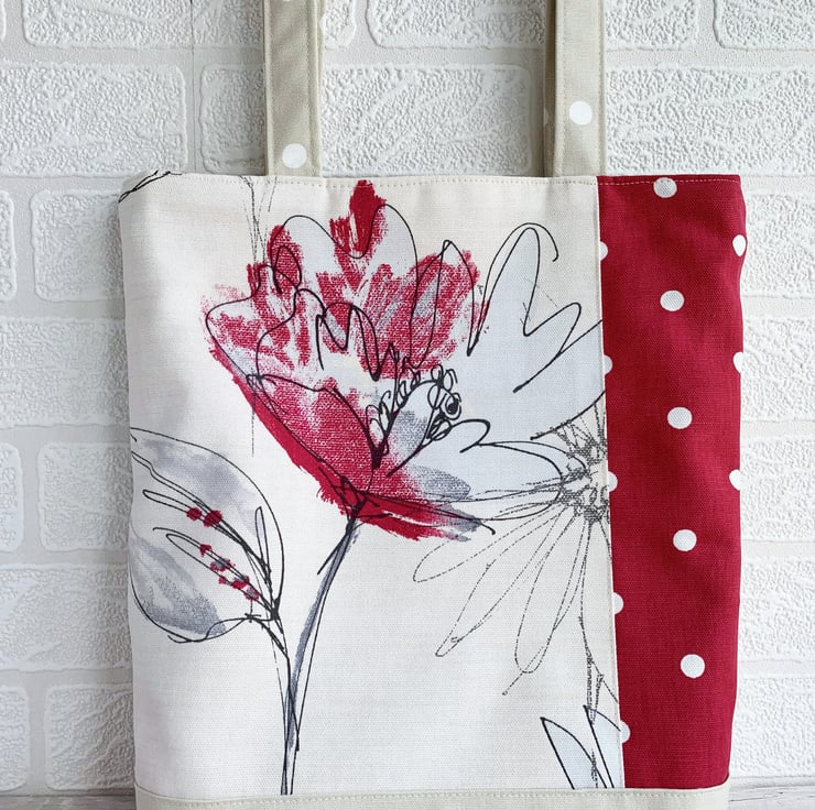 Polka dot tote bag with red flower. A handy tote bag in three beautifully co-ordinating fabrics. The handles, the back of the bag and the lower front are made from creamy-beige fabric with white polka dots. The upper front is made from two fabrics. One is another polka dot fabric in red with white polka dots, and the other is the main feature of the bag; a lovely cream fabric with a print pattern featuring a roughly sketched flower and leaf on a stem. The pattern has black outlines and splashes of red and grey. The bag is lined with a gorgeous soft velvety cream fabric that has an almost fleecy feel.