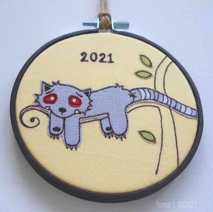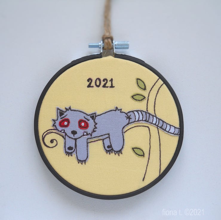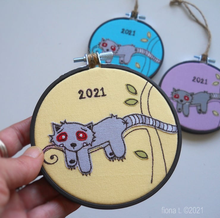 raw edge applique & free machine embroidered miniature red panda zombie in a painted 4" wooden hoop - yellow