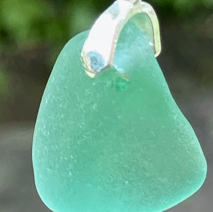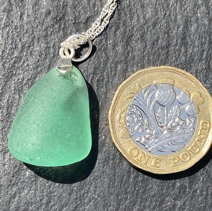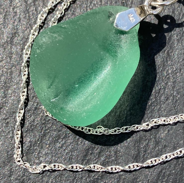 This lovely, well smoothed, jade green seaglass is a corner piece of glass and this adds additional depth of colour to the piece. When I found it, I took a photo as it was on top of the stones. It has a Sterling silver mount and is on an 18in Sterling silver rope chain. The glass is approximately triangular in shape and is approx 2.4cm in length and 1.8cm at its widest point.