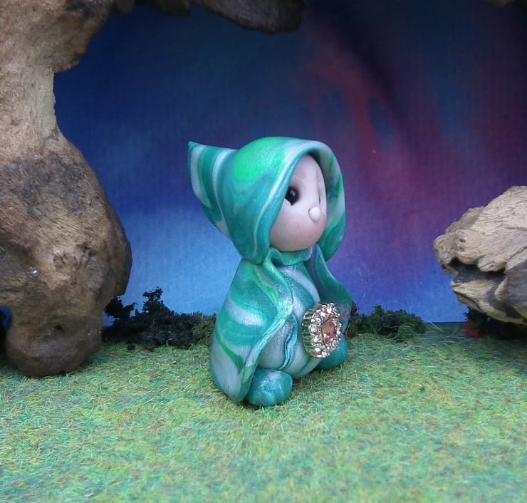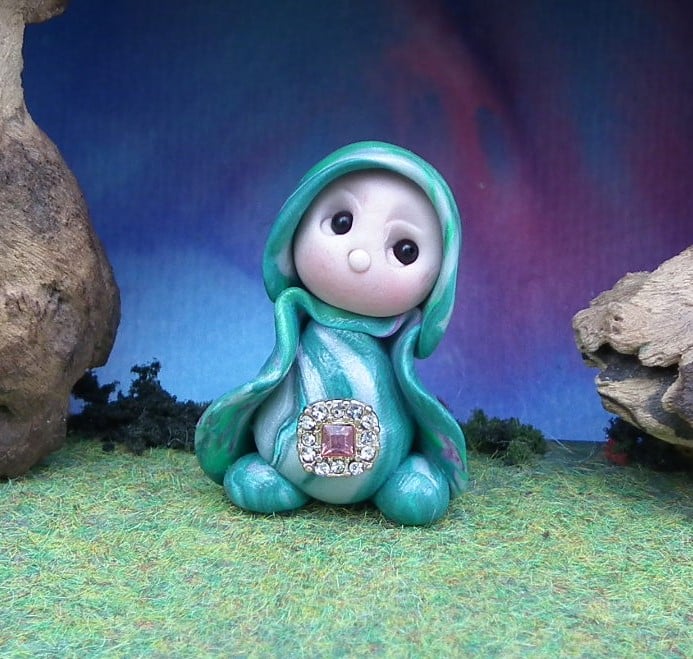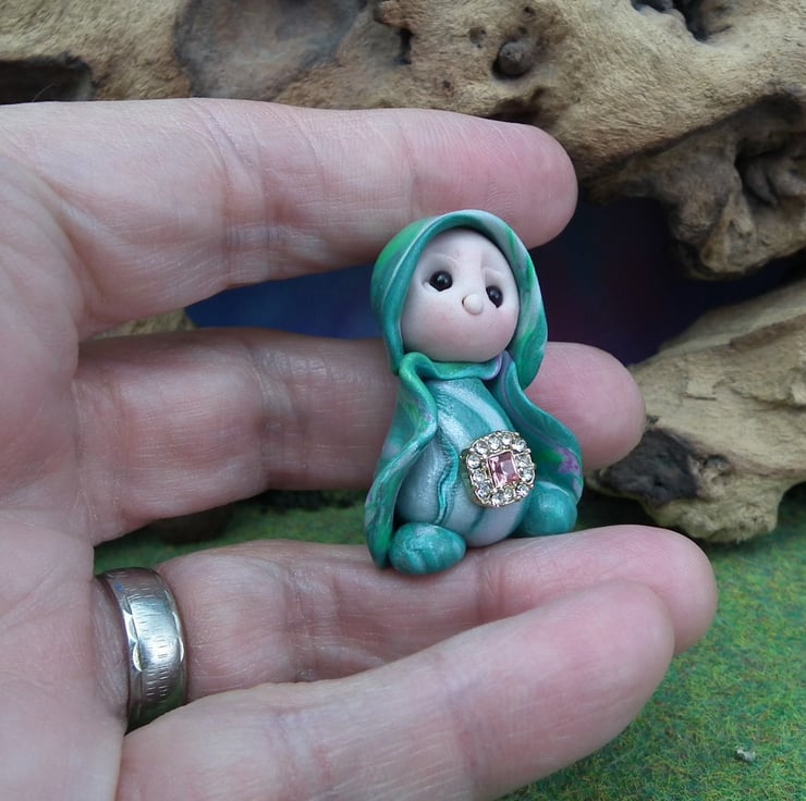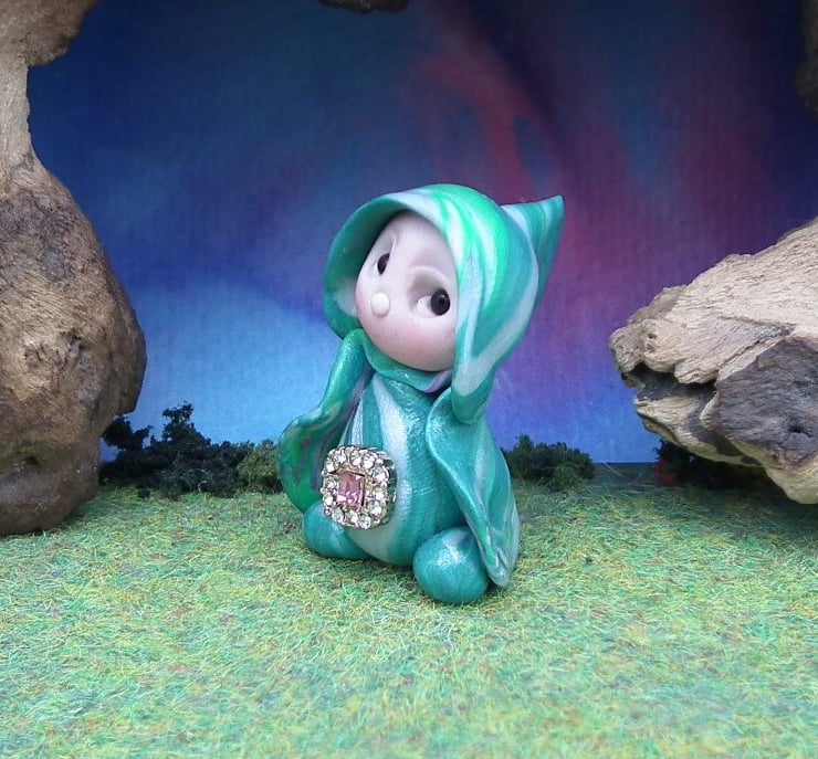 This is a 'one of a kind' creation having been entirely handmade without the use of moulds here at my studio on the Sussex Coast. Modelled with Prosculpt polymers, painted with heat set paints before sealing with lacquer, Frayl has sparkling black onyx eyes and sparkling jewelled belt. Frayl the Garden Gnome is just one and a half inches tall.