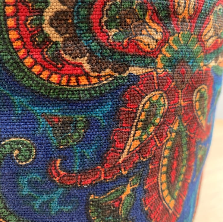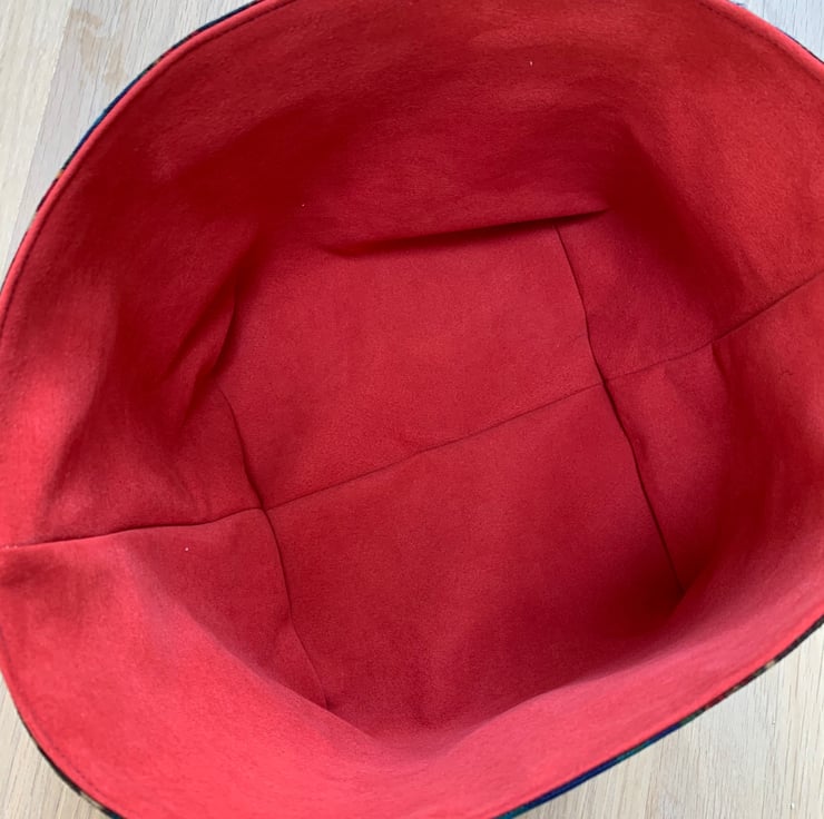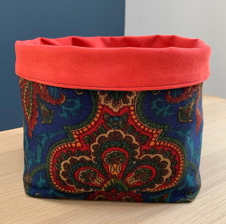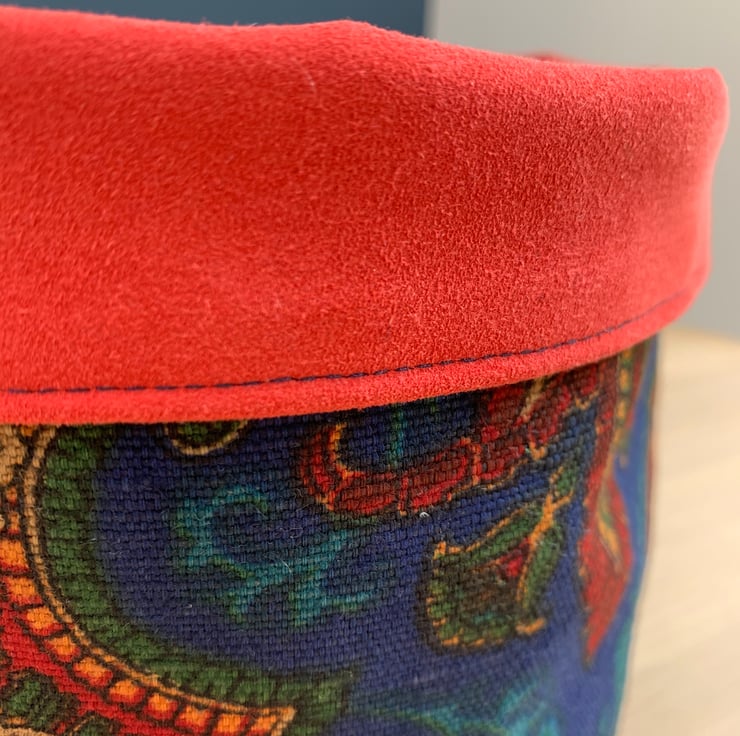 Reversible fabric basket made from reclaimed Liberty of London upholstery fabric and soft red faux suede. Can be used with a turn-down to make the most of the contrasting fabrics.