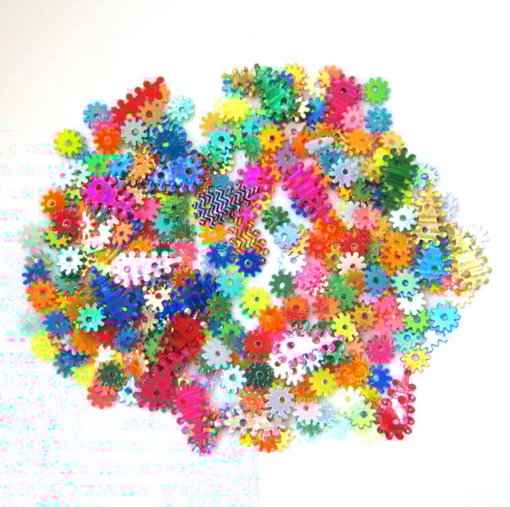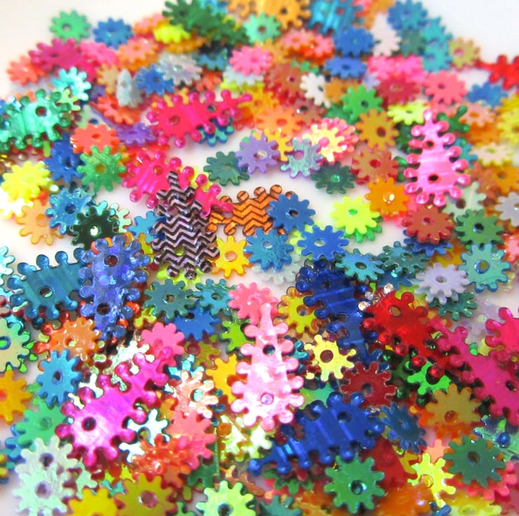 These sequins have an iridescent/holographic effect. The smaller ones are flower / cog shaped, and the others are a teardrop 'cog' shape.