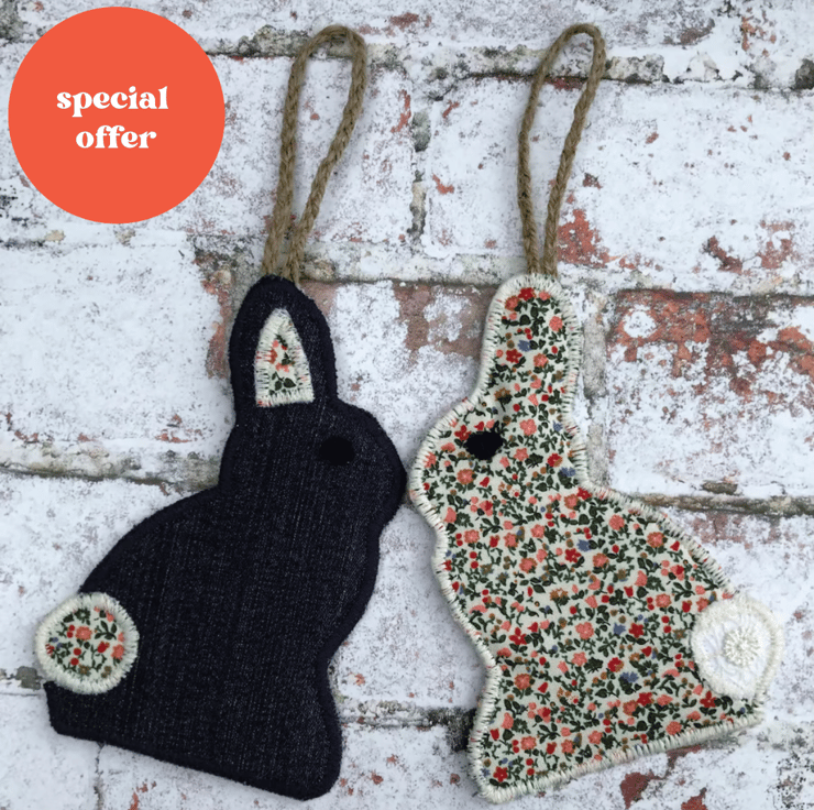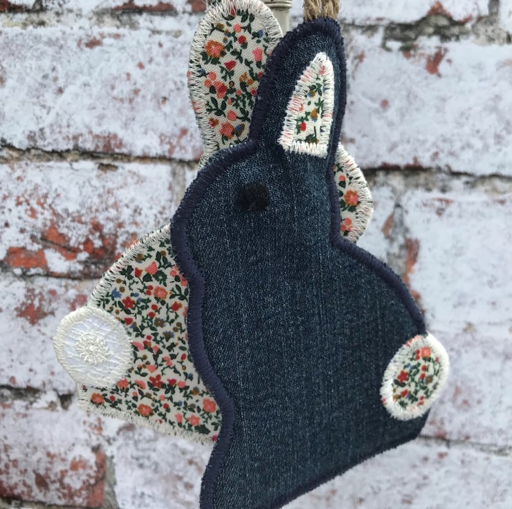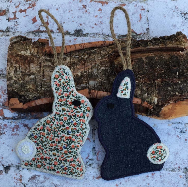 Rabbit two is in classic Denim fabric, with the same Liberty floral fabric as Rabbit one, on the ears and tail, finished with black embroidery thread hand stitched eyes, and a jute string plaited hanging loop.