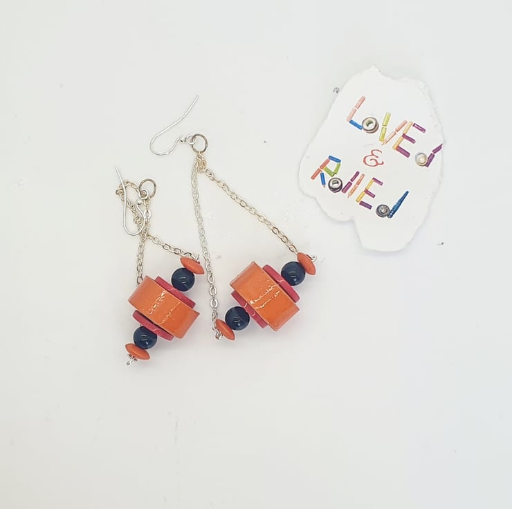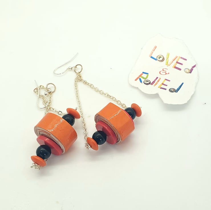 A pair of dangling earrings made with orange paper beads, completed with preloved black and orange beads.