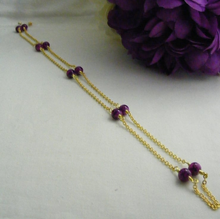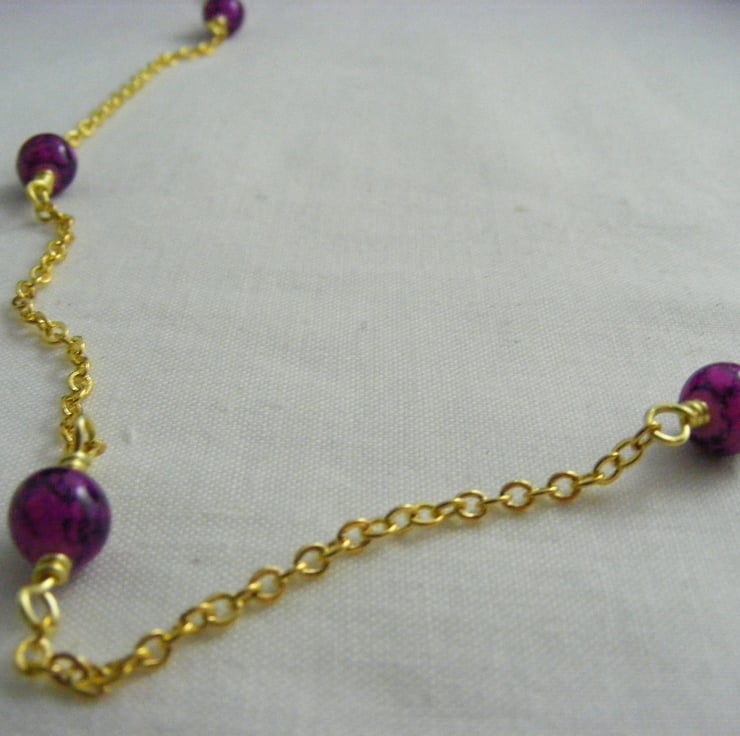 8 mm magenta and black round glass beads, gold plated oval link chain, Gold plated wire and rubber connectors.