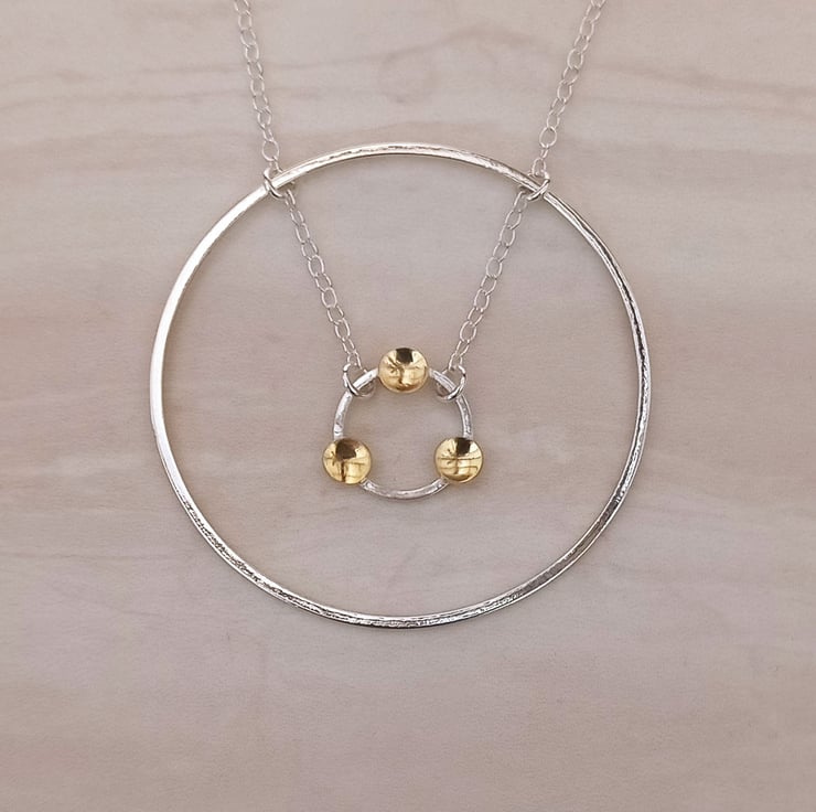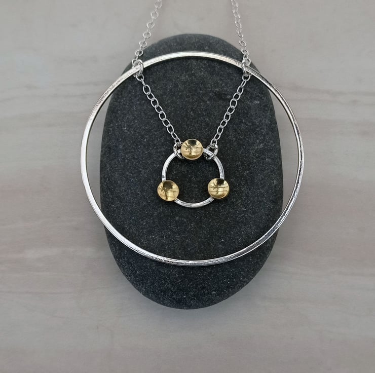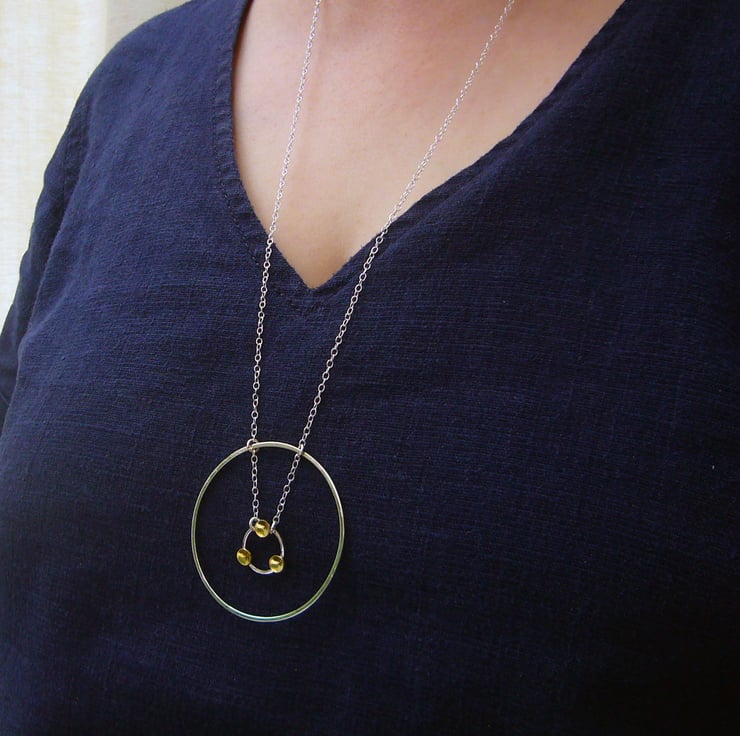 This unique, minimalist, necklace would make a lovely gift. I have made this necklace by shaping 1.2mm square sterling silver wire into 2 circles; 3 brass cups have then been soldered onto the centre circle. This necklace is part of a collection of pieces made with sterling silver square wire.