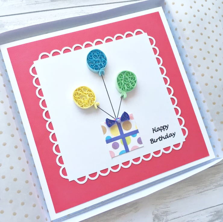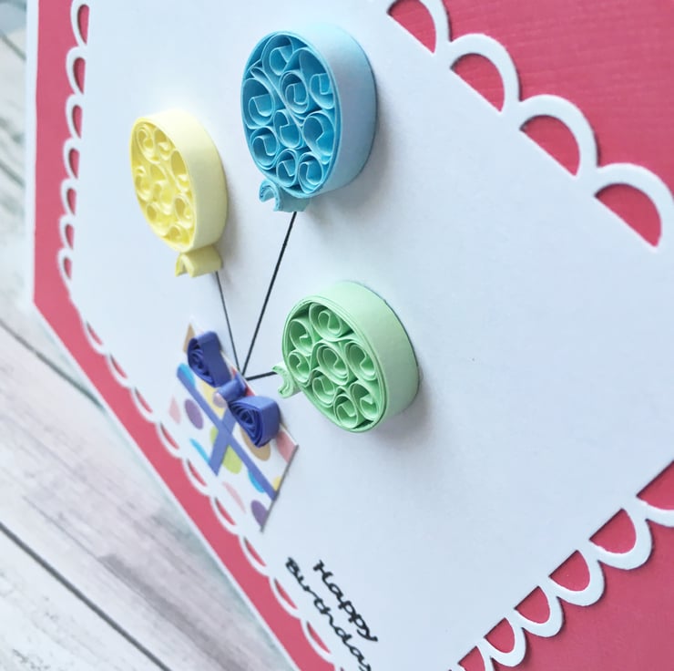 This card features three quilled balloons in pastel shades attached to a lightly glittered dotted gift box topped with a lilac quilled bow.