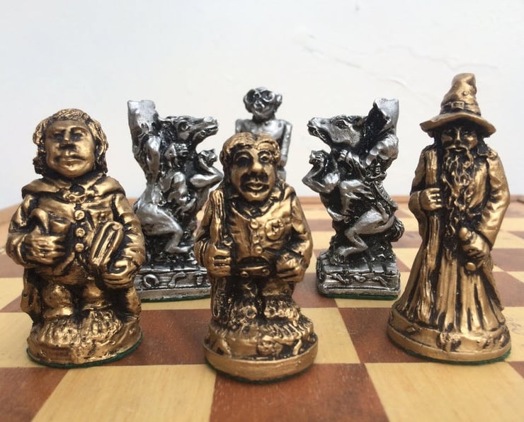 This wonderfully carved chess set is a reproduction of on an old ornamental chess set inspired by the two beautifully animated movies of the late 1970's and early 1980's. It represents a golden age in Lord o the Rings art and culture and is absolutely a must for LOTR or Hobbit fans of all ages. I love the new movies but this chess harks back to a time when drawings and artists impressions were what we had to relate to outside of our own imagination. This collection of chess pieces is a thing of great beauty and is sure to be a talking point for any Lord of the Rings Fans out there.