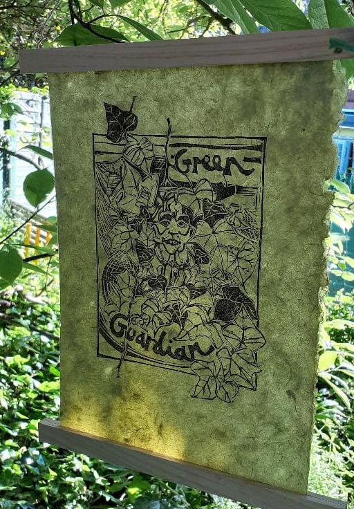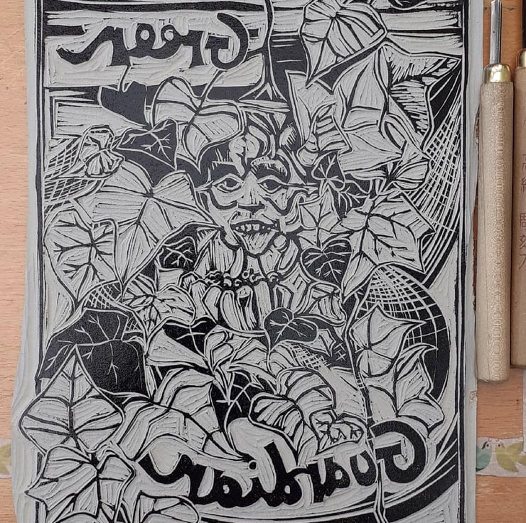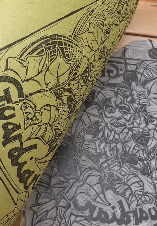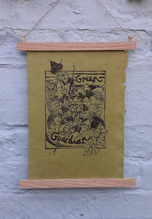 Once I had decided on my final design for this print, it was transferred onto lino which was hand cut and then hand burnished in black ink onto a beautiful lime coloured ‘Lokta’, a stunning paper handmade in Nepal. The inconsistencies from paper to paper are a big part of the beauty and charm of this handmade surface.
