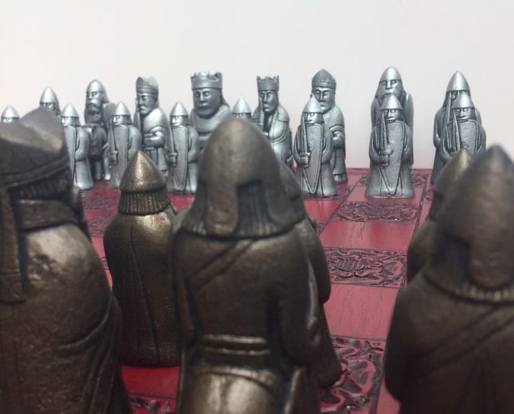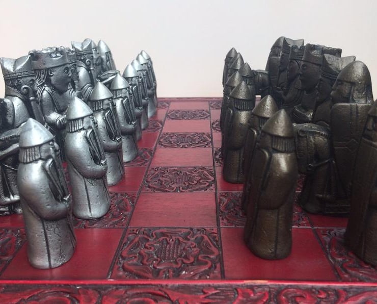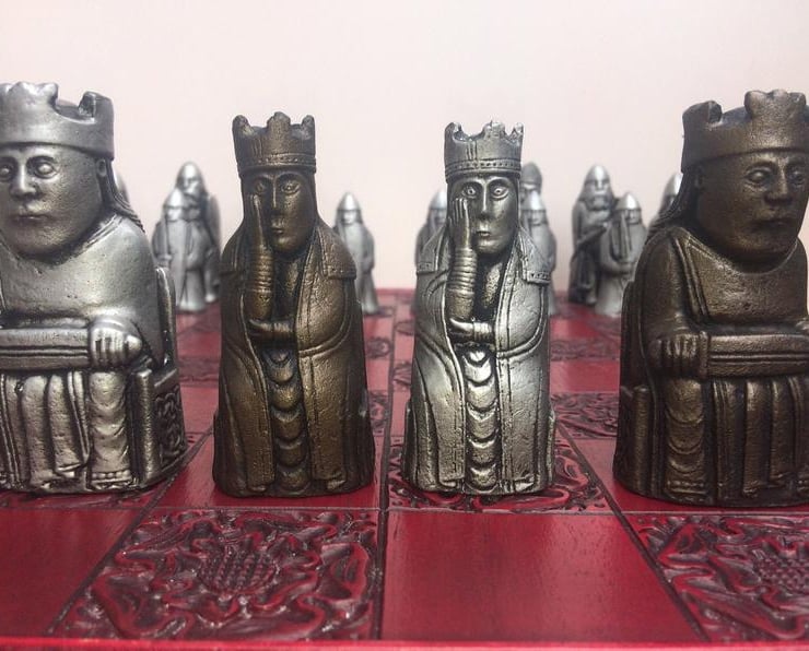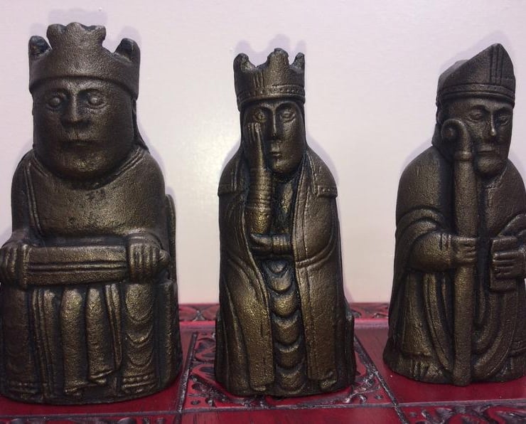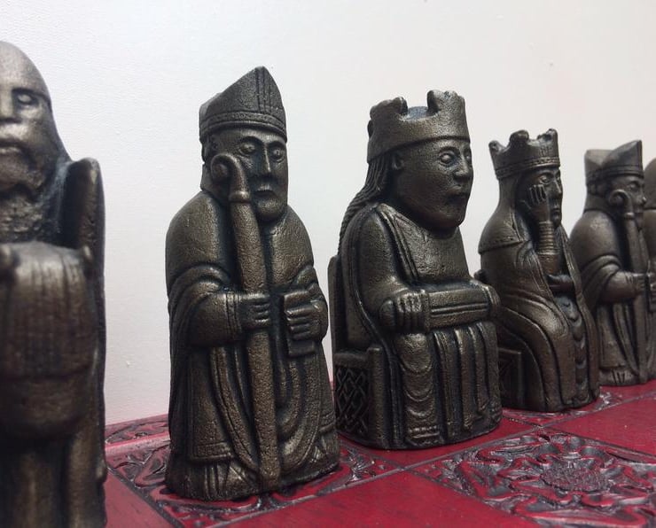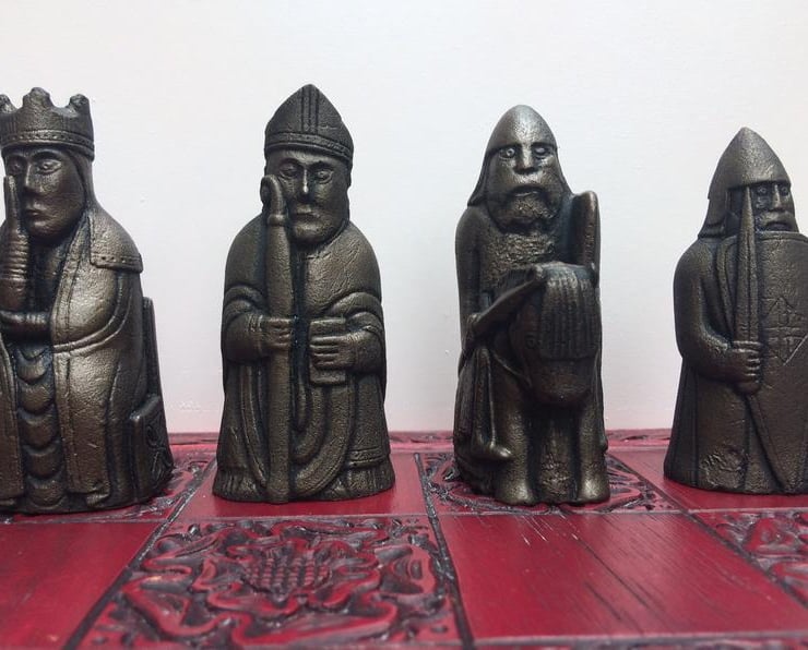This listing is for a beautiful and ornate hand crafted, made to order collection of Isle of Lewis Chessmen (Chess pieces only). The original chessmen were made in the 12th century by Norwegian craftsmen and hidden by traders on the Isle of Lewis in the Outer Hebrides of Scotland where they lay undetected until 1831 when they were discovered by a local farmer.
