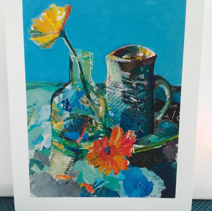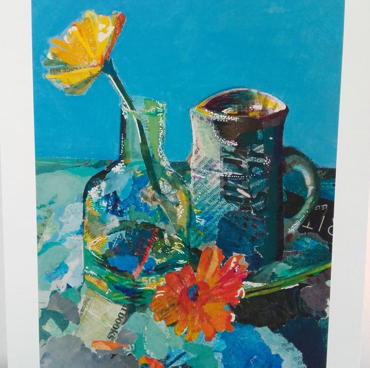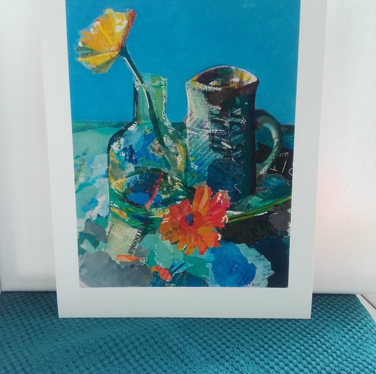 This is a print of an original still life study of flowers and vases.