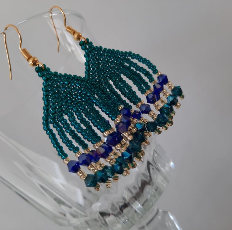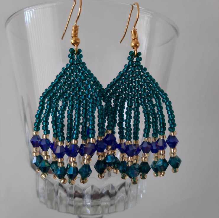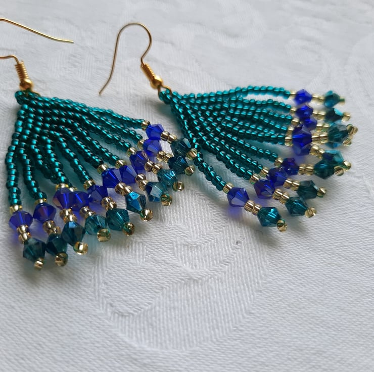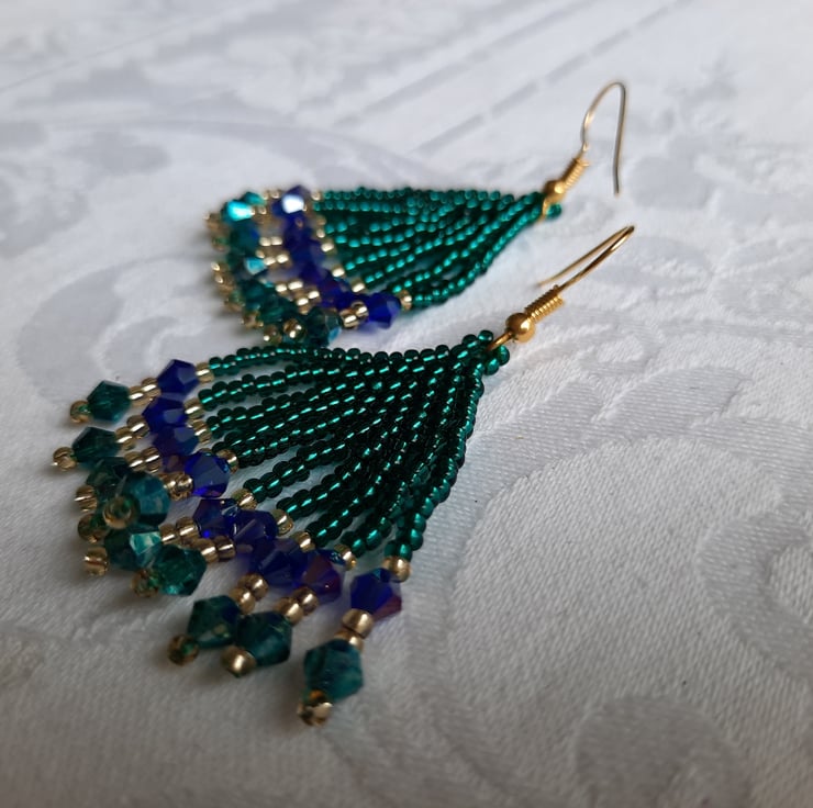 This lovely pair of blue and green tassel earrings are made with silver lined green and gold Japanese seed beads, green and blue glass bicone beads with an AB (rainbow finish) and gold plated ear wires. They have a drop of around 4.5cm from the base of the ear wire and are approx. 3cm wide. Can be worn for both casual and formal wear.