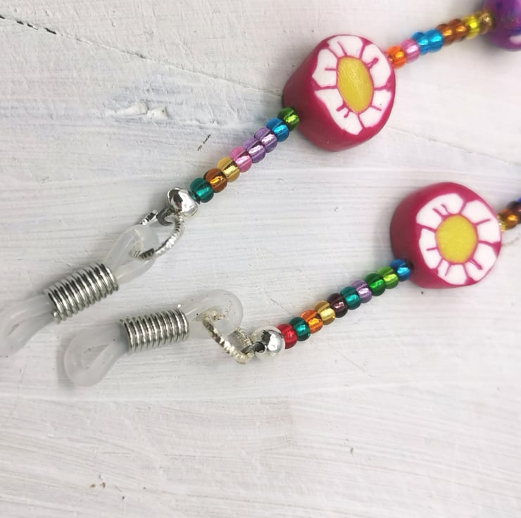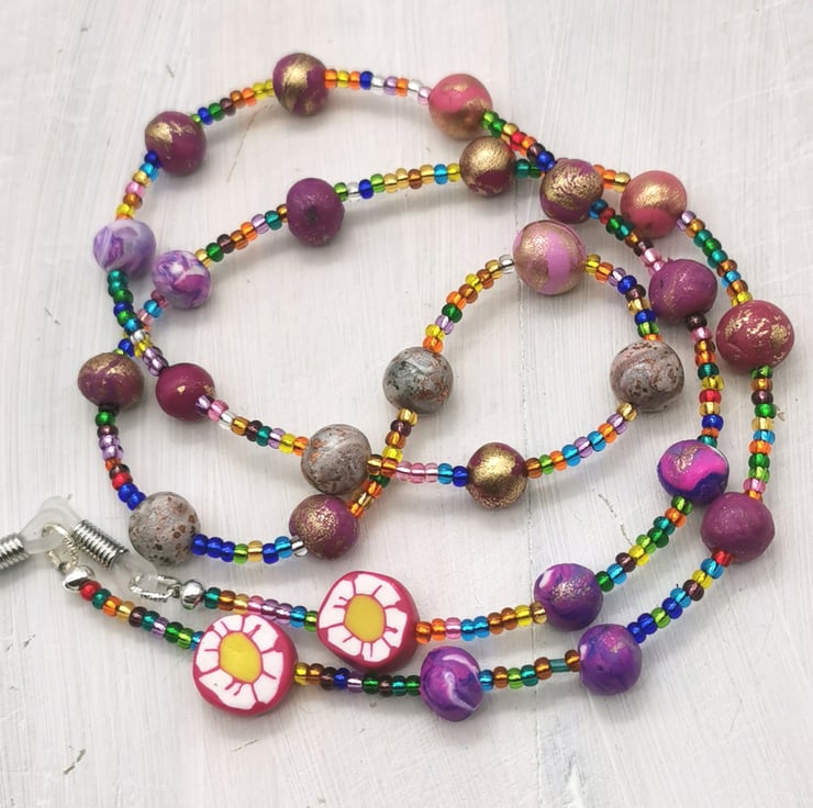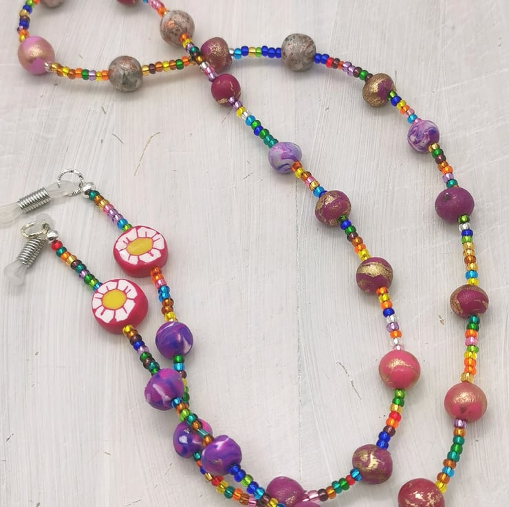 Artisan polymer clay beads are interspersed with multi-coloured seed beads to create this, unique, eye-catching glasses chain/lanyard. Whether used in combination with sunglasses or specs this cheerful, lightweight, easy to wear lanyard/chain is bound to put a smile on your face and others.