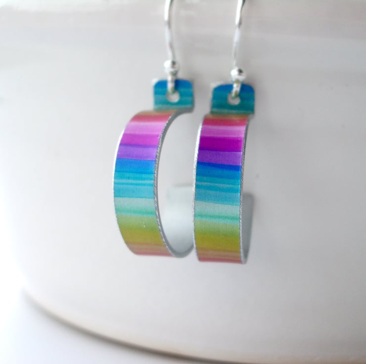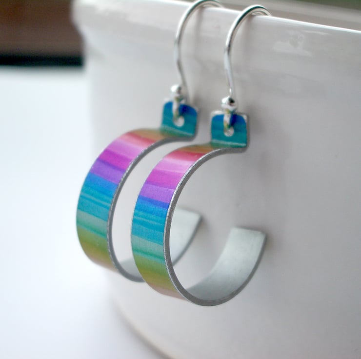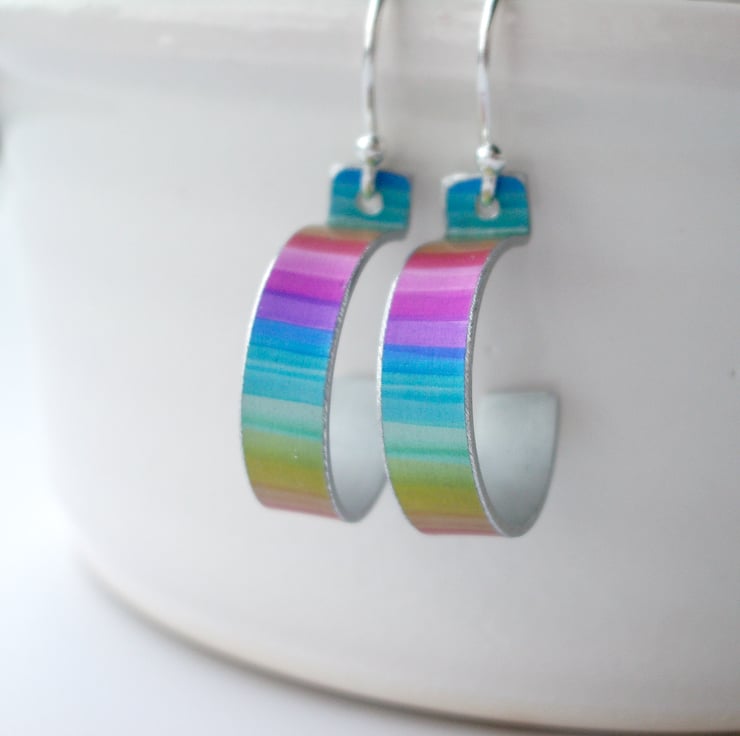 These hoop earrings are made from aluminium which I have hand dyed in a random pattern of rainbow stripes. The dye is sealed in to the metal through heat so that it becomes a permanent part of the surface of the aluminium. I have cut out the strips of aluminium and bent them on a mandrel in to a half hooped shape earring. The hoops are attached to a sterling silver fish hook style ear fitting. The hoops measure approximately 5mm across and from the top of the aluminium hoop to the bottom it measures 21mm.