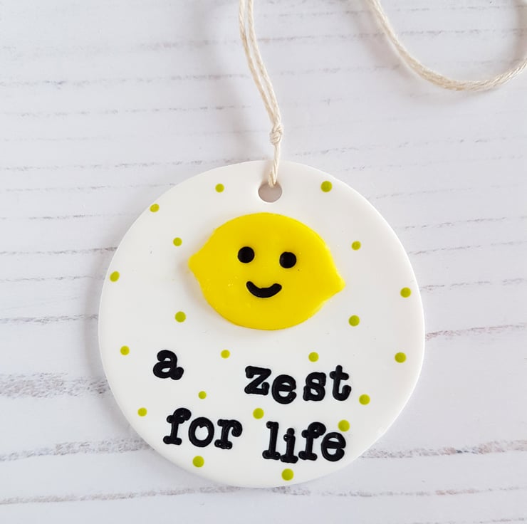 This quirky decoration is hand made by myself using polymer clay, featuring a smiley lemon in the centre. The phrase 'A zest for life' is hand stamped with individual letters at the bottom of the clay circle, then carefully hand painted using black paint for extra definition. Dots are also hand painted using acrylic paint.