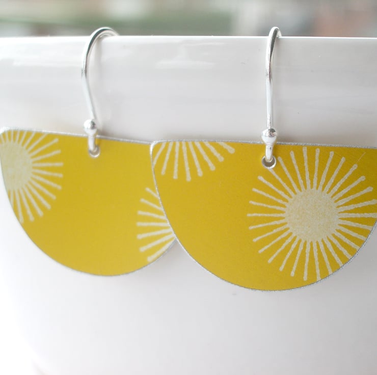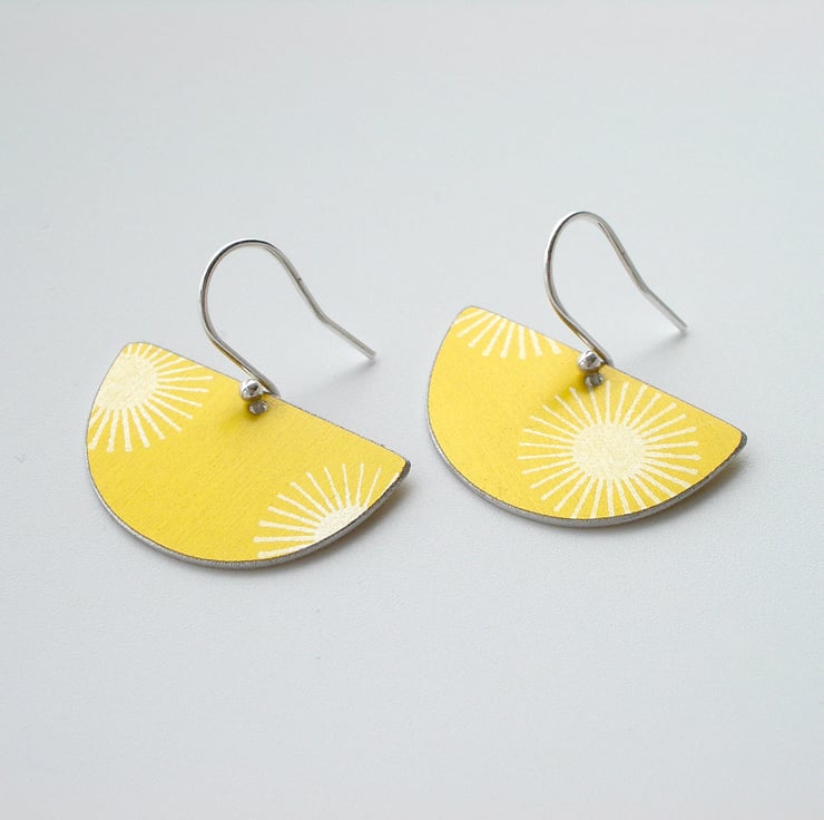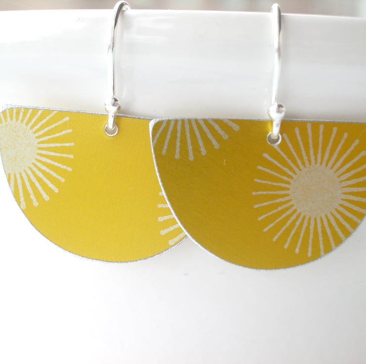 These mid century style fan shaped earrings are made from aluminium which I have hand dyed and printed in a lovely yellow. The sunburst patterns are silver. I cut out the fan shape with a piercing saw and file the edges to give a nice smooth finish and a silvery edge.