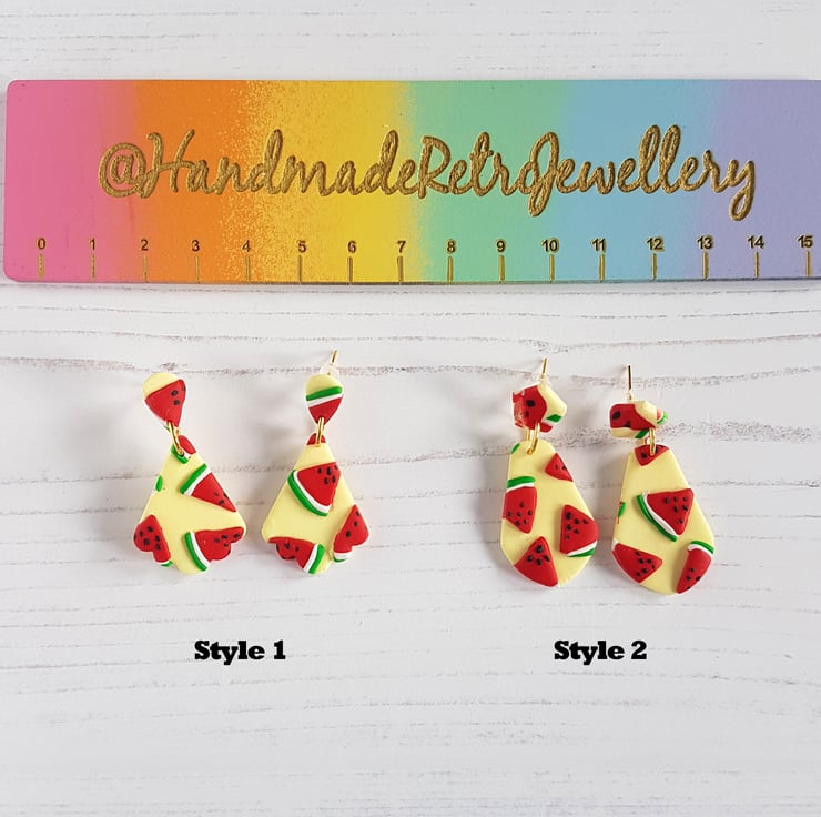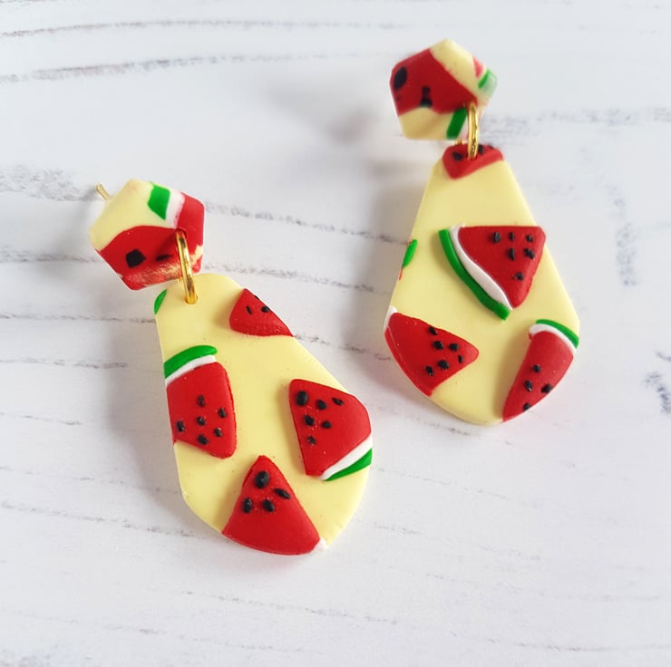 These bold and unique earrings have been carefully hand crafted using polymer clay, starting with a pastel yellow flat layer of clay, then small watermelons hand cut out of clay, carefully placed all over the yellow to create a 'slab'. This has then been cut into shape and edges have been sanded for a smooth finish. Holes have been made in each piece, with a silver plated jump hoop attaching them and silver plated stud posts secured onto the top shape pieces. Secured with a rubber back, they are then ready to wear!