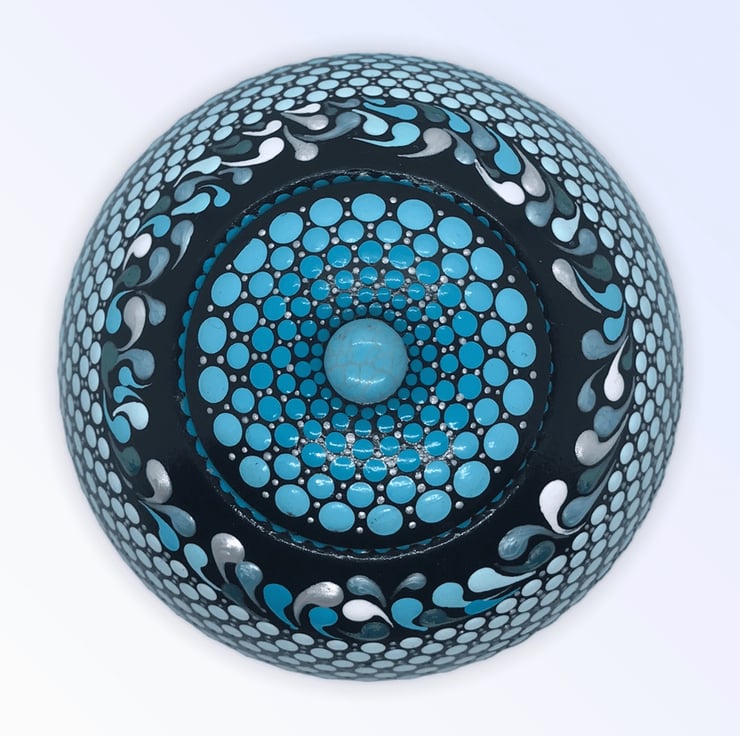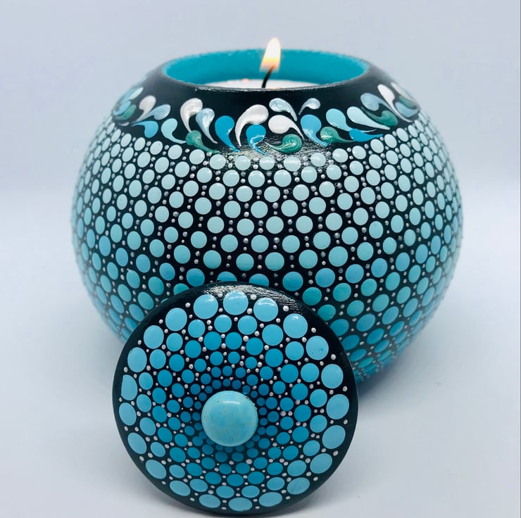 Colours of the Arctic … fire and ice … this was my inspiration for painting this candle holder. Pearls and turquoise give a feeling of serenity. When not occupied by a candle, the void can be used to keep safe a little treasure or trinket.