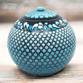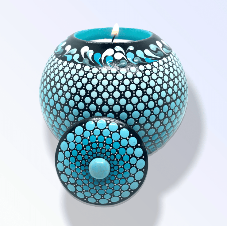 Handmade and meticulously hand painted. Weighing 575g and made of solid CrystalCal fine plaster. This tea light holder features a lid embellished with a genuine Turquoise stone.