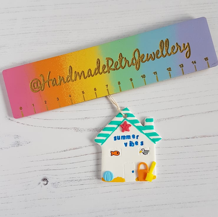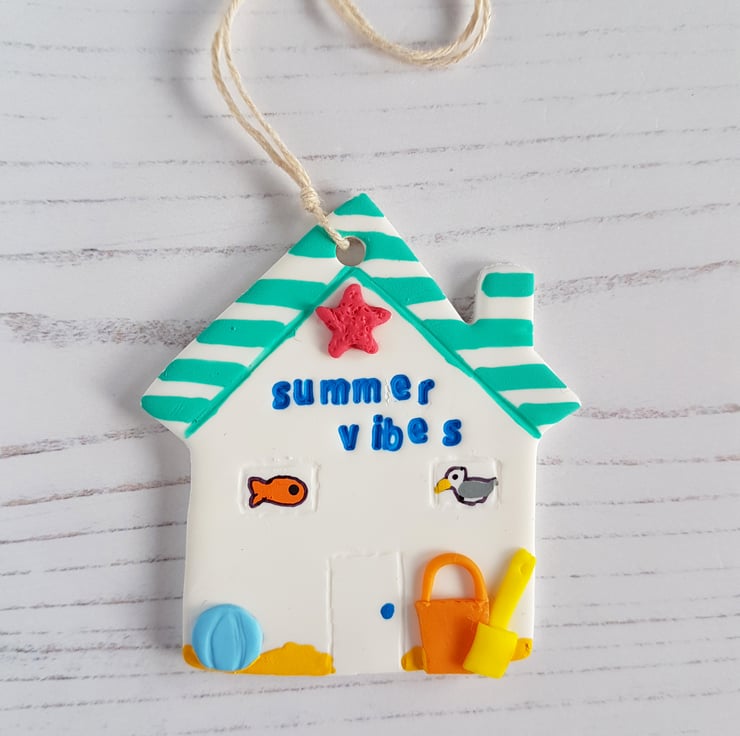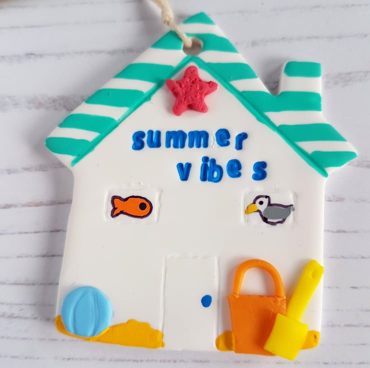 This little house shaped decoration is made of polymer clay, with SUMMER VIBES stamped by hand using mini individual letters, and detail hand painted using acrylic paint to finish. Also carefully crafted in clay and placed onto the decoration is a pink starfish, bucket and spade and blue beach ball. Turquoise stripes are hand painted for the striped beach hut effect, along with yellow sand along the bottom Finished off with a cute hand painted fish and seagull in each of the windows!