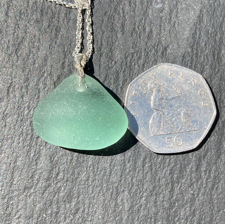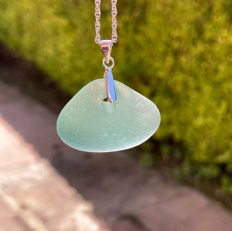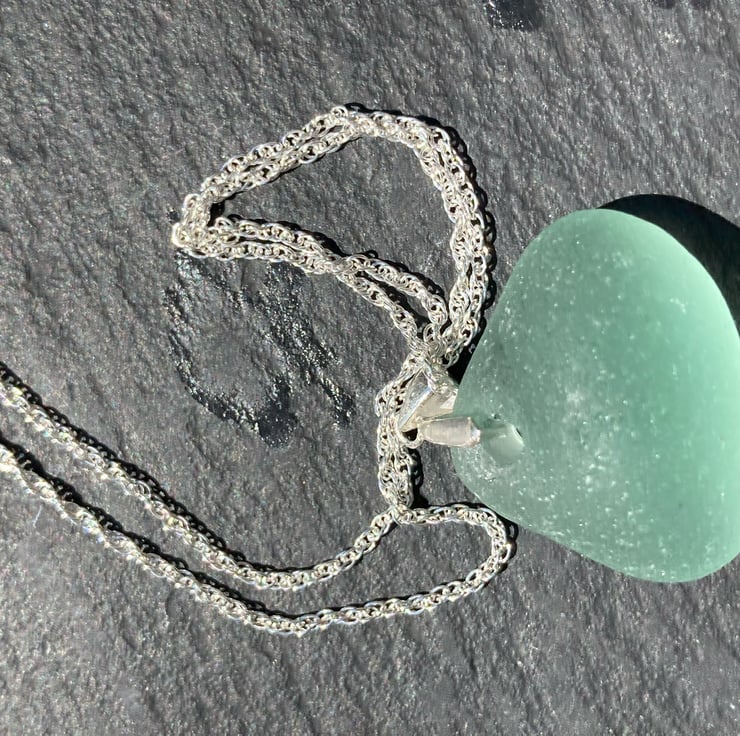 This chunky pyramid-shaped piece of blue-green seaglass probably started life as a bottle as this looks very much like a well smoothed corner of a bottle base. The glass has been drilled so a Sterling silver mount can be connected for the chain to be threaded through. The Sterling silver chain is an 18inch rope design.