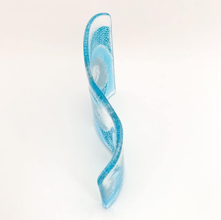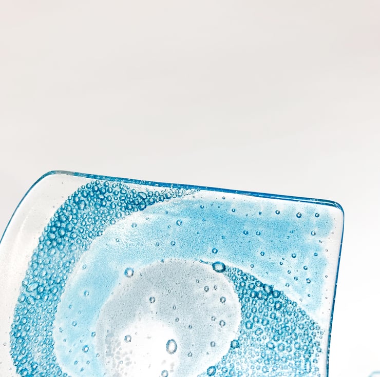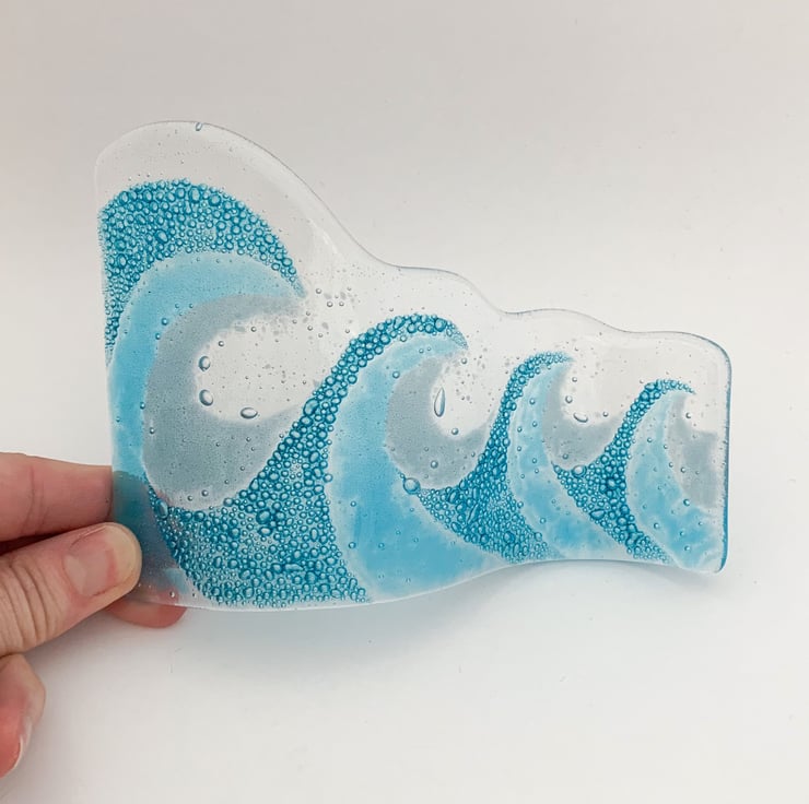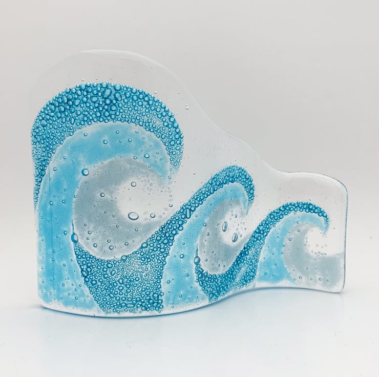 To make it, I hand cut transparent cut art glass into 2 wave shapes and used specialist paints and powdered glass to create my wave design. I then fused it overnight slowly in my kiln. In the heat of the kiln, the specialist paint changed into hundreds of tiny turquoise bubbles. When completely cooled, then slumped the wave over a stainless steel mould to create the 3D effect.
