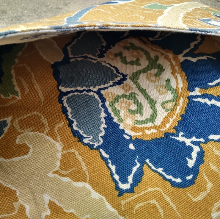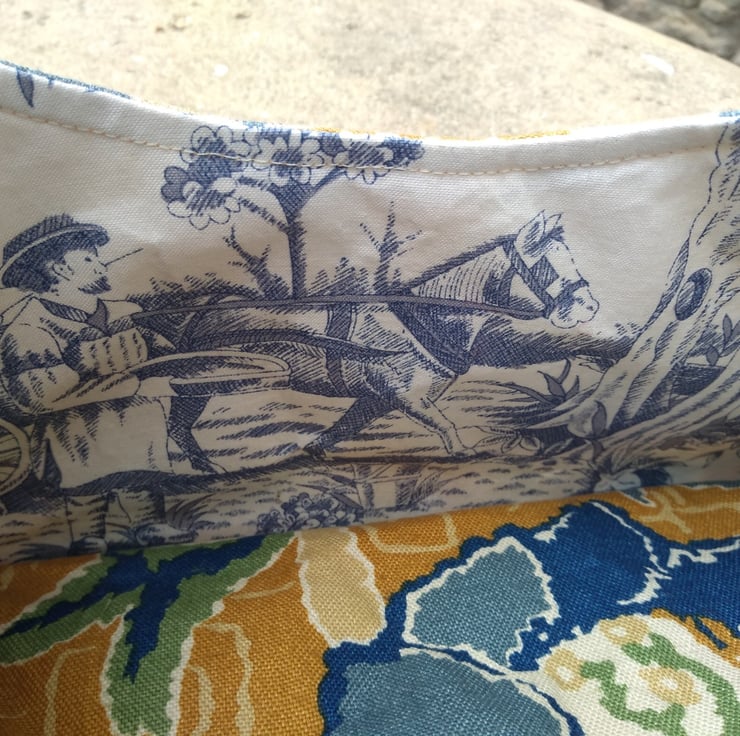The outer fabric of the case has been made using a vintage linen called 'Glen' by the world-renowned Designer John Stefanidis. Although the fabric is from 1988 it is in perfect condition with vibrant tones of mustard yellow, bright blues and soft green. The inner fabric is a English Toile de Jouy fabric in classic blue and off-white displaying charming pastoral scenes of human figures and farm animals.