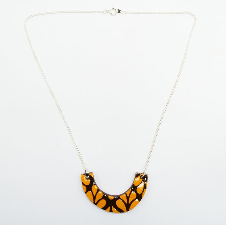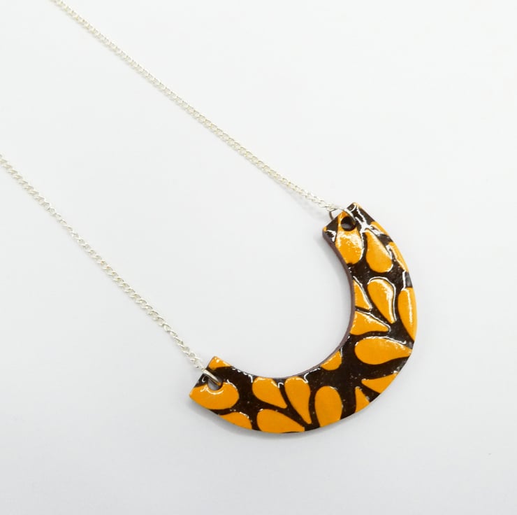 This is a orange and brown inverted arch shaped necklace suspended on a silver plate curb chain necklace. The pendant is made from an Etruscan terracotta clay and has been printed on the surface using bright coloured slips, this is then finished with a clear glaze to make the colours pop. The necklace has a ring clasp.