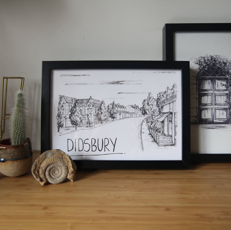 The black and white illustration of Didsbury which is in Manchester, features the main high street and the clock which is a local landmark of this suburb.