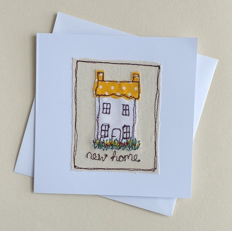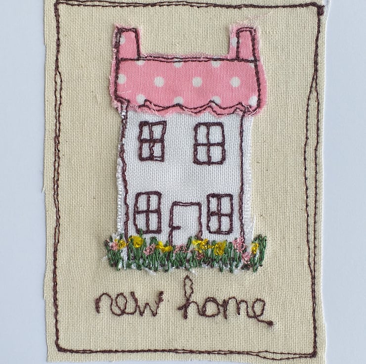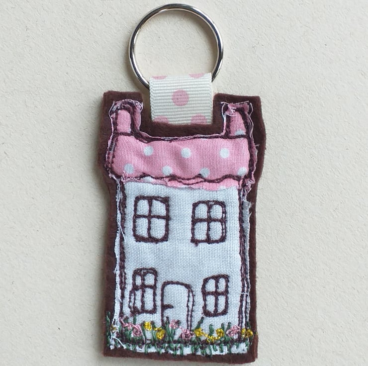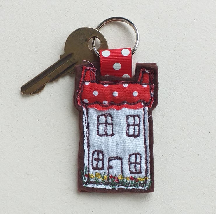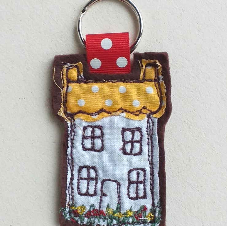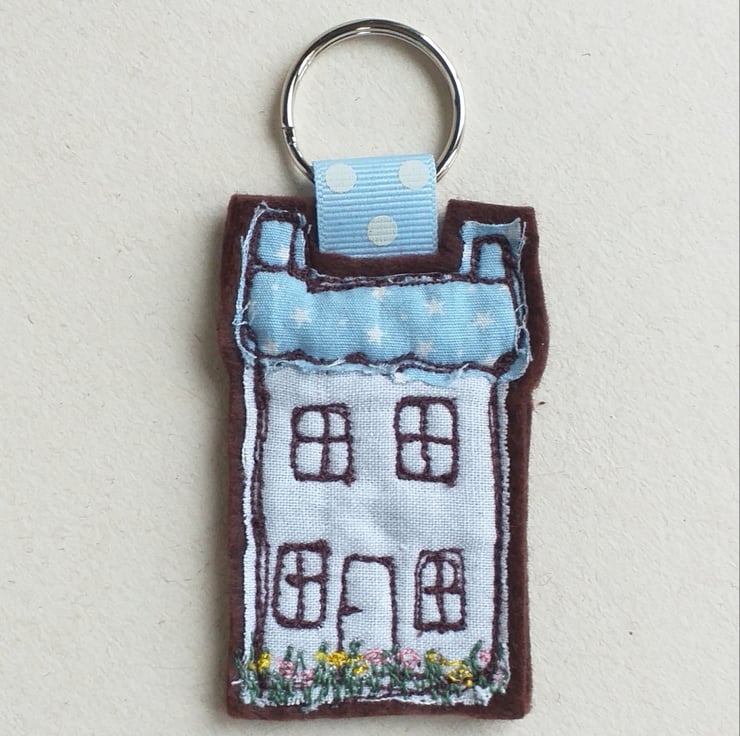 A key ring depicting a wee fabric house appliqued onto felt, with an embroidered garden done in free motion embroidery. Perfect little new home gift. The house measures approximately 7cm high and 4cm wide.
