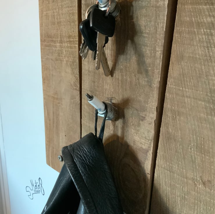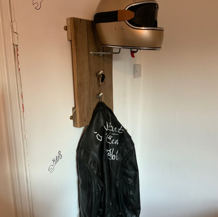 Bespoke handmade motorcycle helmet and gear storage solution. Made with reclaimed wood and other industrial materials. Shown wall mounted, I also make steel stands for these. These tidy’s look great, are functional and use up materials that otherwise would end up in landfill.