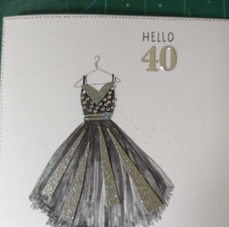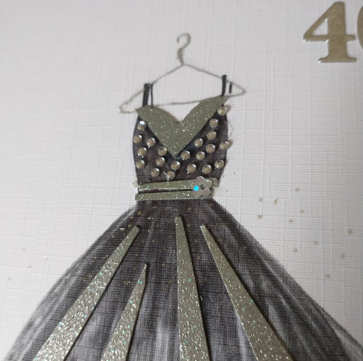 A completely handmade and uniquely designed card. Consisting of a beautiful going out dress hand drawn and coloured in black and silver onto quality linen effect pristine white card. Hello 40. Bodice embellished with silver rhinestones