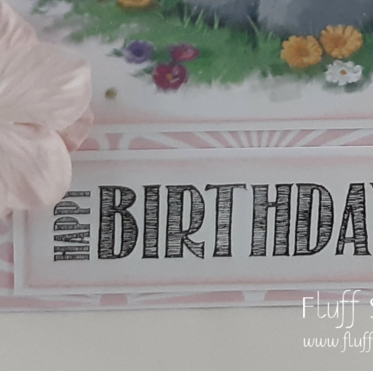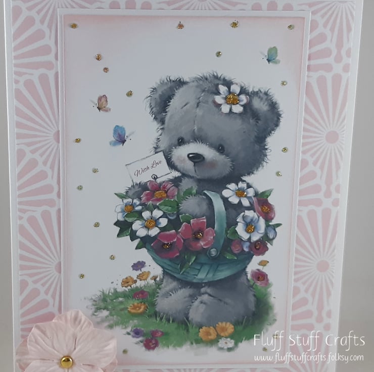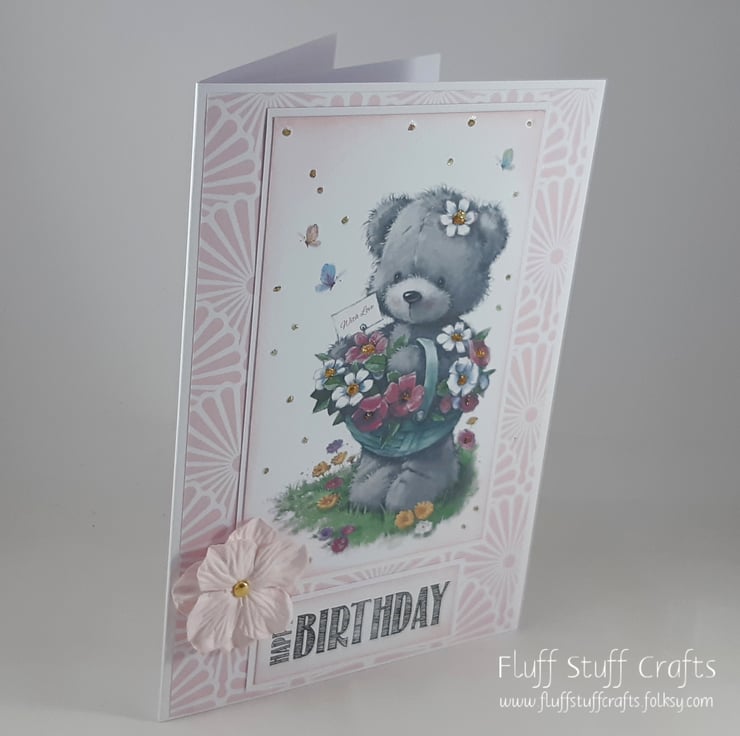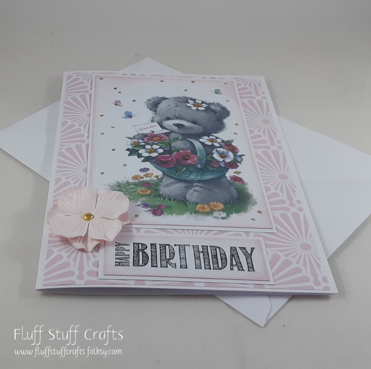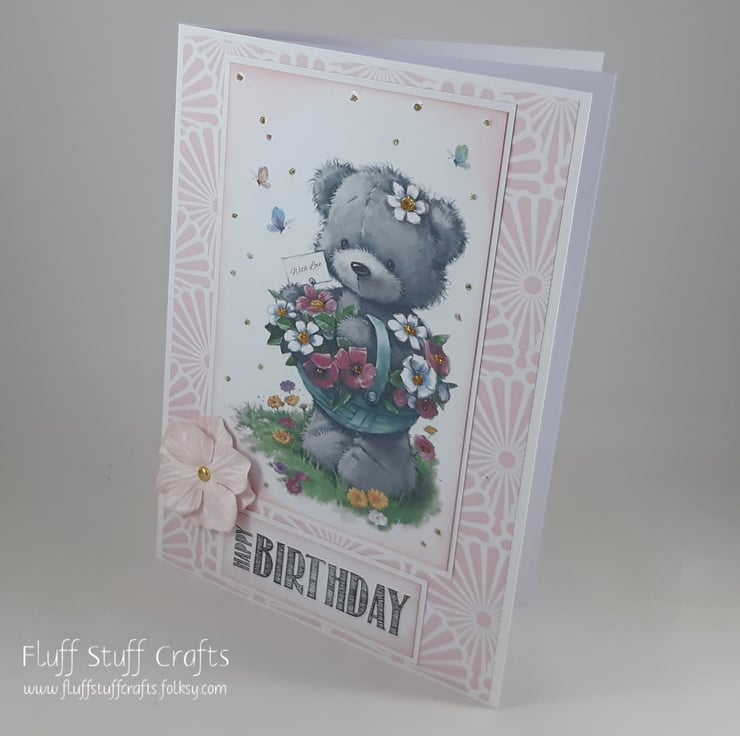 Birthday card featuring an image of a cute teddy bear with a basket of flowers. Both the image and sentiment 'Happy Birthday' have been edged in pale pink distress ink and mounted onto white card, over a pink and white patterned background. The image has been glittered and the card is finished with a pale pink paper flower.