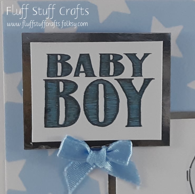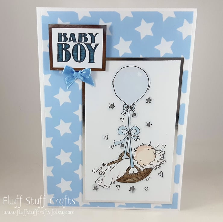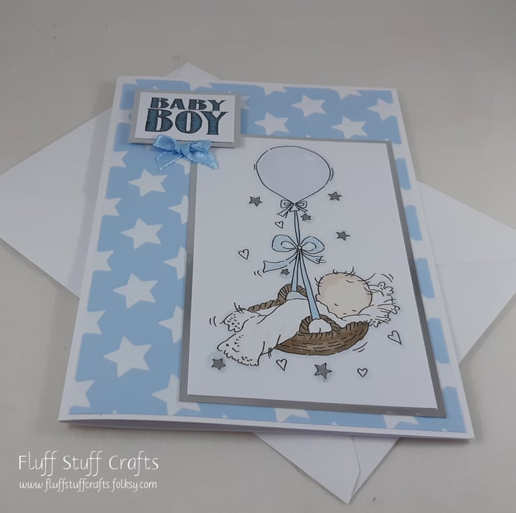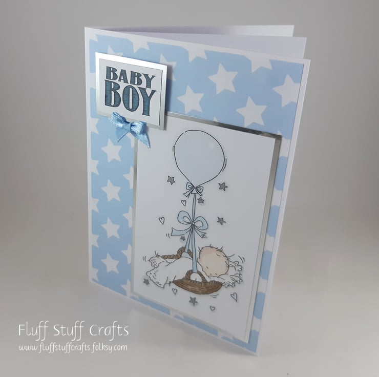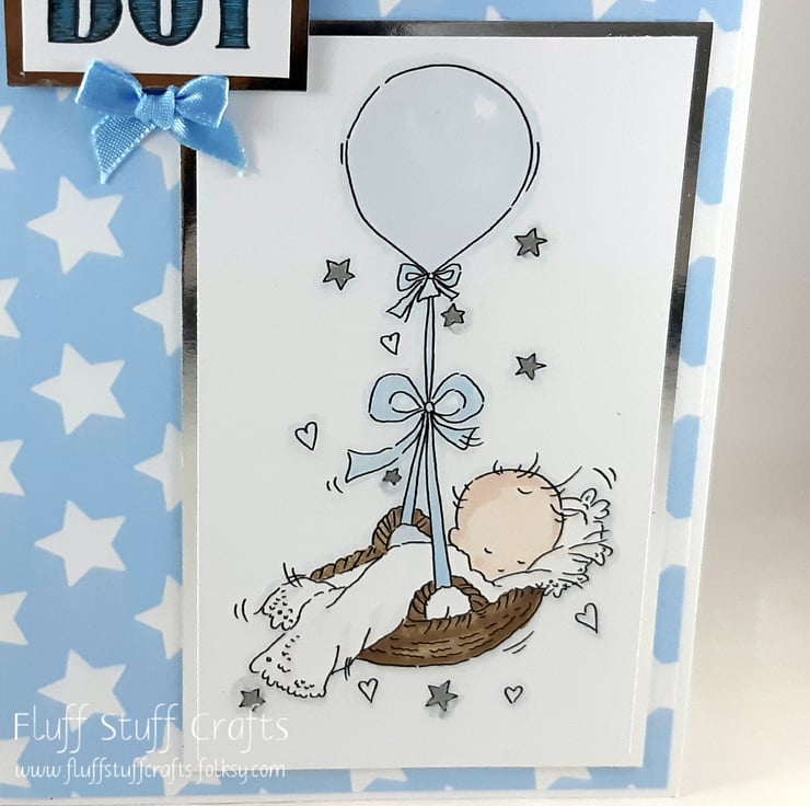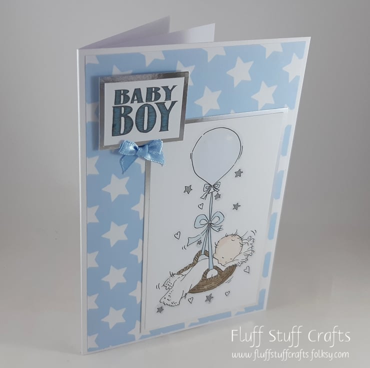 New baby boy card which features a hand coloured image of a baby in a basket, carried by a balloon. The image and sentiment 'Baby Boy' have both been mounted onto silver mirri card, over a pale blue and white starry background. The card is embellished with a small blue satin ribbon bow.