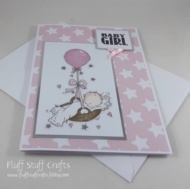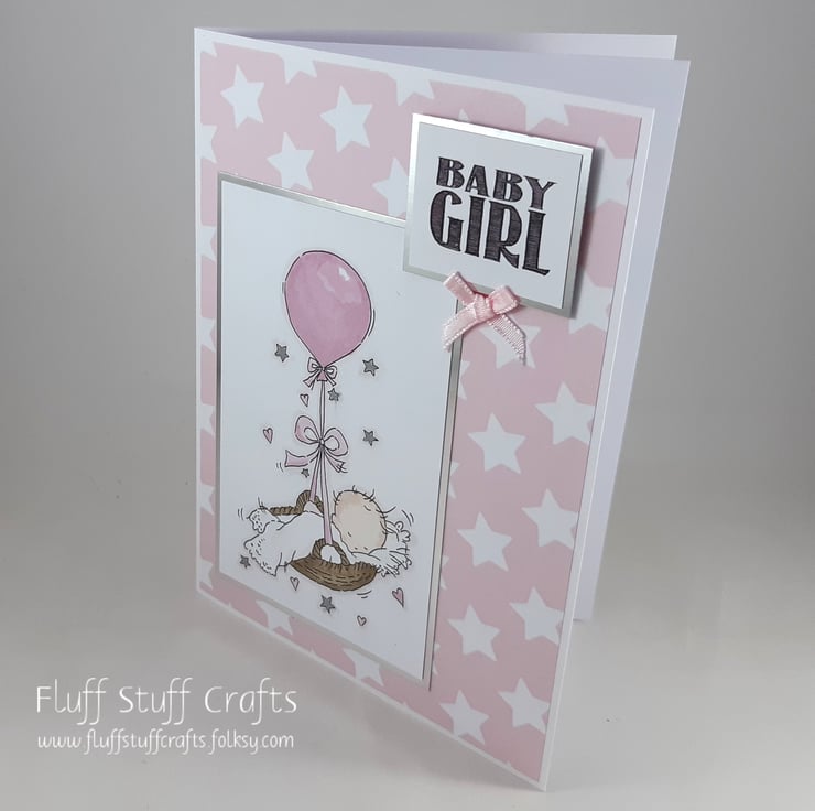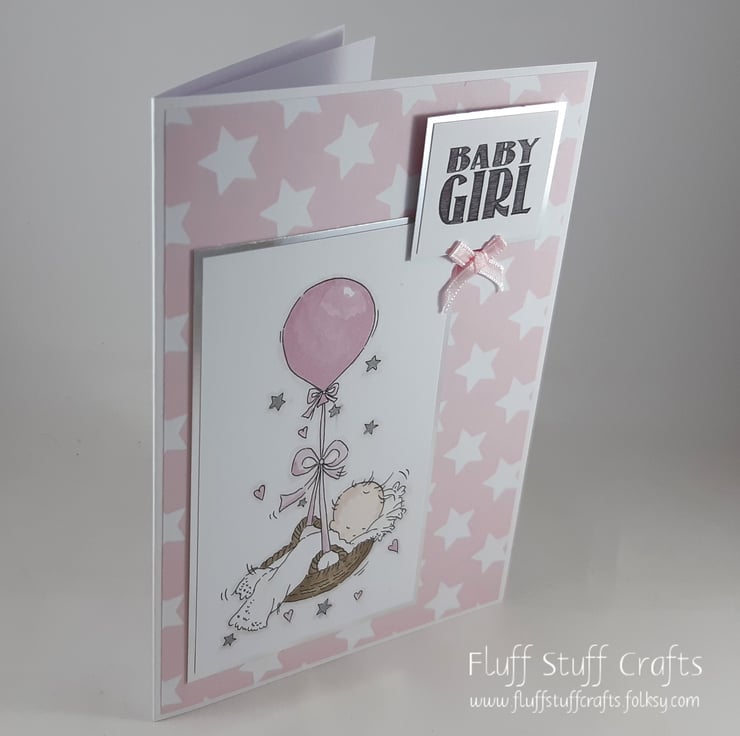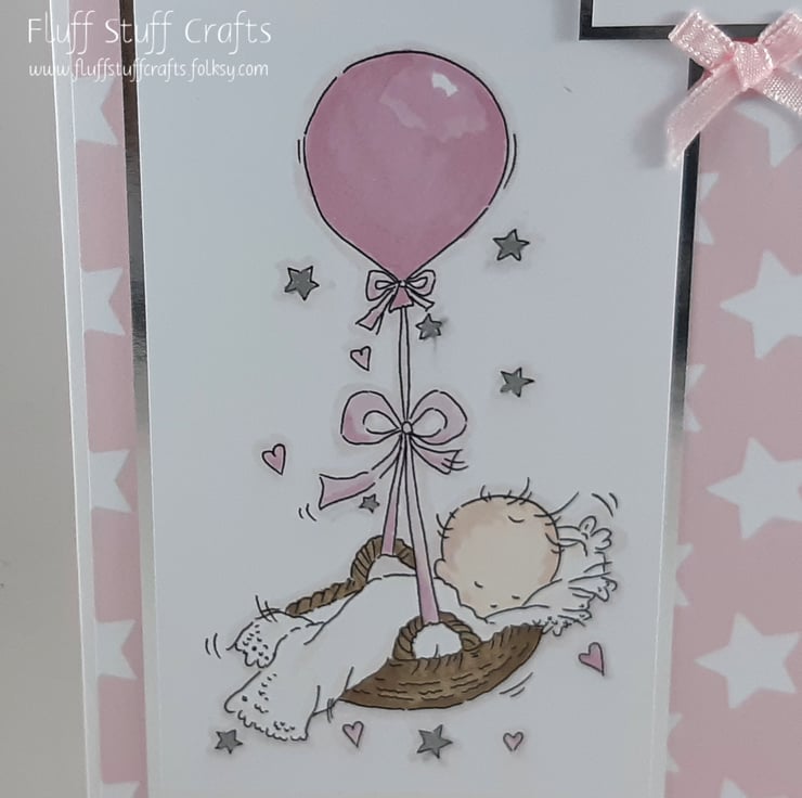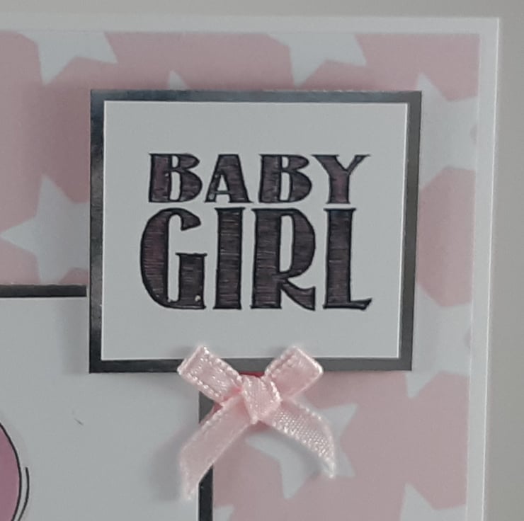 New baby girl card featuring a hand coloured image of a baby in a basket, carried along by a balloon. The image and sentiment 'Baby Girl' have both been mounted onto silver mirri card, over a pink and white star background. The card is embellished with a pink satin ribbon bow.