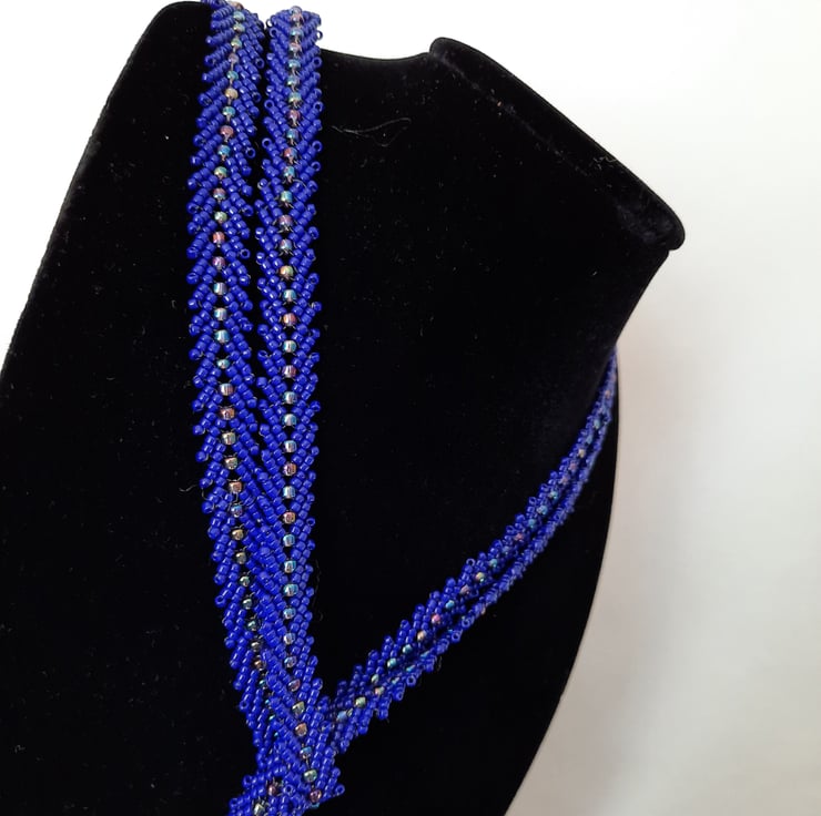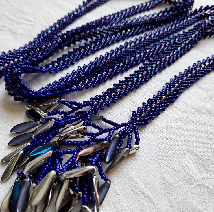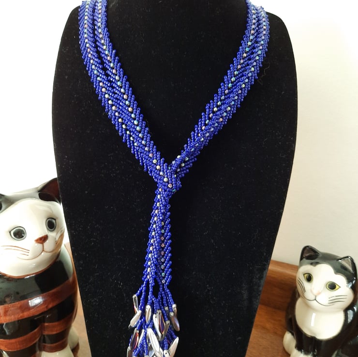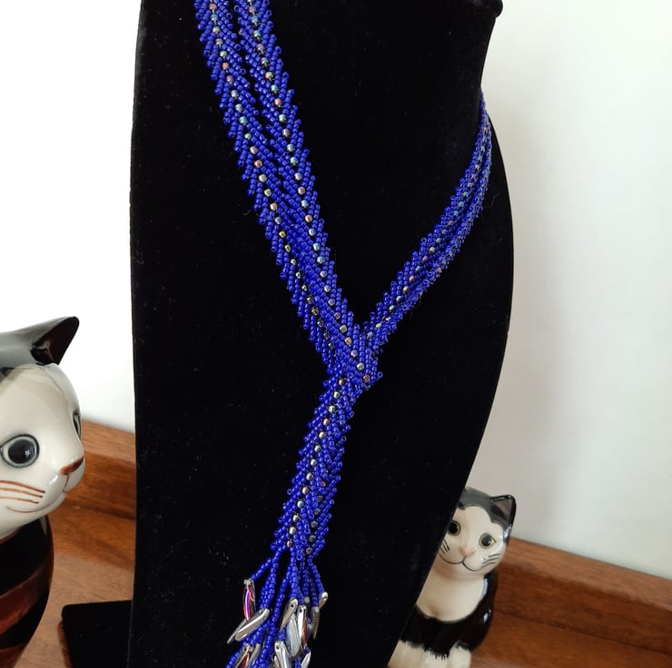 This lariat is made using blue and rainbow effect Japanese seed beads with silver and rainbow effect Czech glass dagger beads. The length of this necklace is approx. 55 inches from end to end, not including the tassels and can be worn in many ways. As the lariat does not have a clap, it is ideal for people who struggle with fasteners. It would make a lovely present and comes in an organza bag.