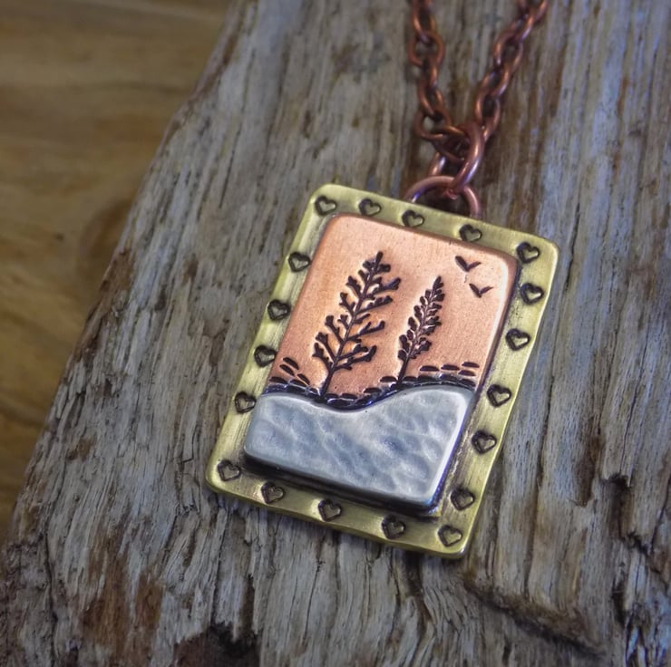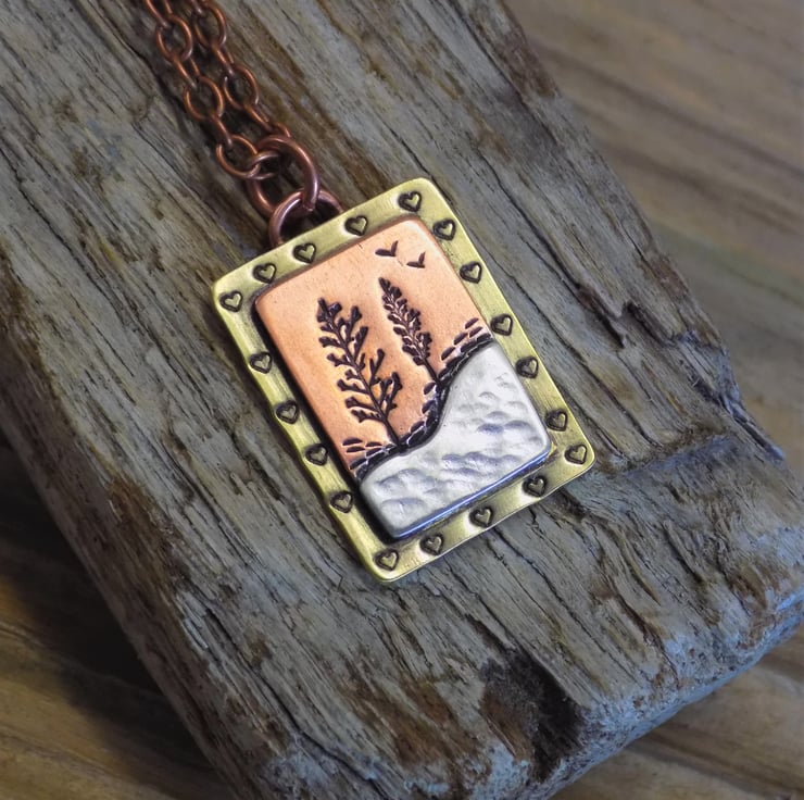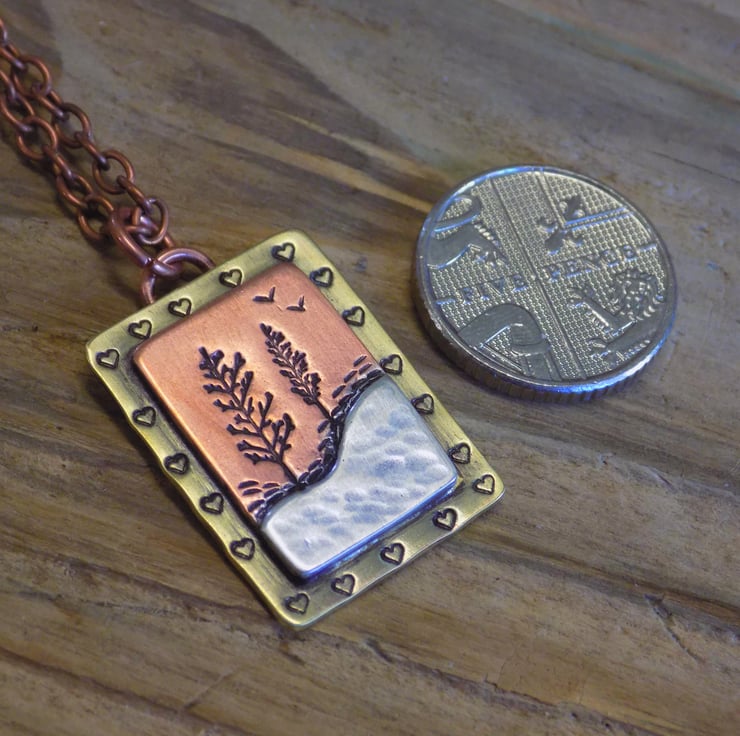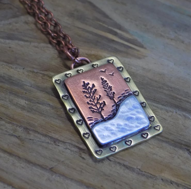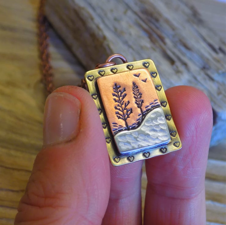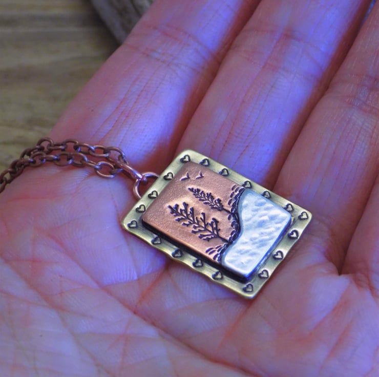 Made from copper, brass and sterling silver sheet. Three layers of metal have very carefully been soldered together to give the impression of a little photo frame in which lies a tiny landscape scene with a pair of birds and trees. The outer frame has been decorated with tiny hearts and the pendant is suspended from an 18-20" adjustable copper tone necklace.
