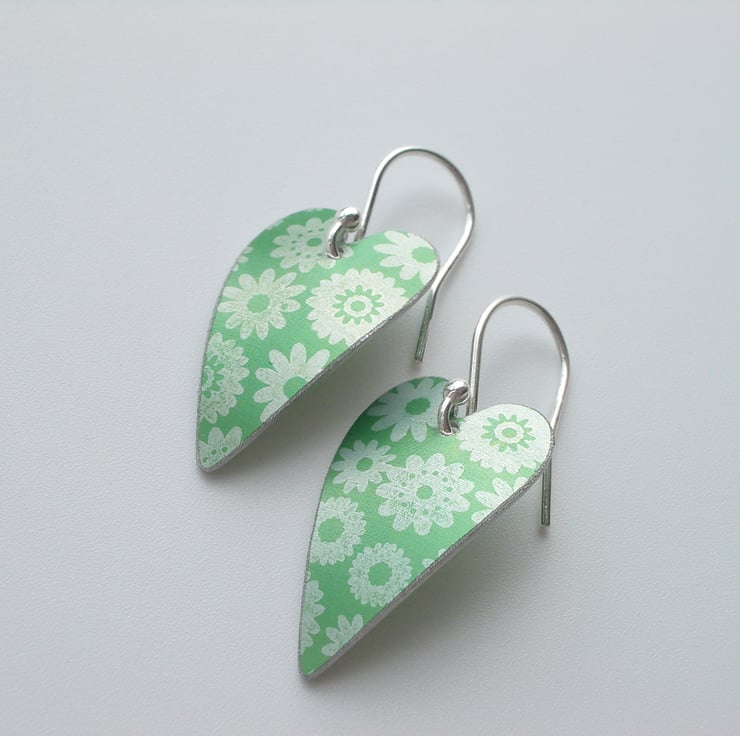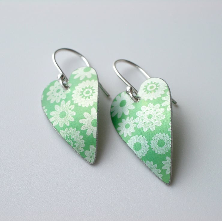 These heart earrings are made from aluminium which I have dyed in a bright green colour adding silver flower prints. I then seal the dye so that it becomes a permanent part of the metal. I cut out the heart shapes by hand, using a piercing saw, then dome them so that they catch the light.