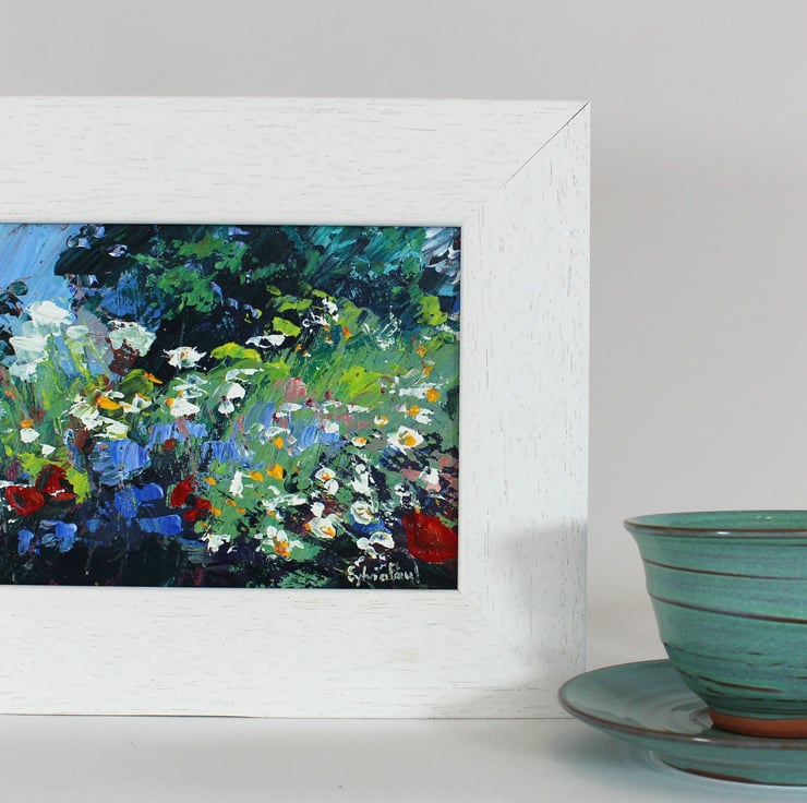 This painting measures 20 x 15 cm and is painted on MDF board in acrylic. It comes with a frame and including the frame it measures 28 x 23 cm. I use a palette knife to apply the paint in an expressive way capturing the colours and textures of the local landscape.