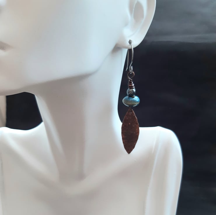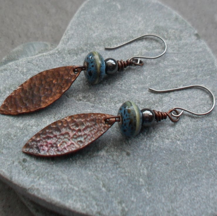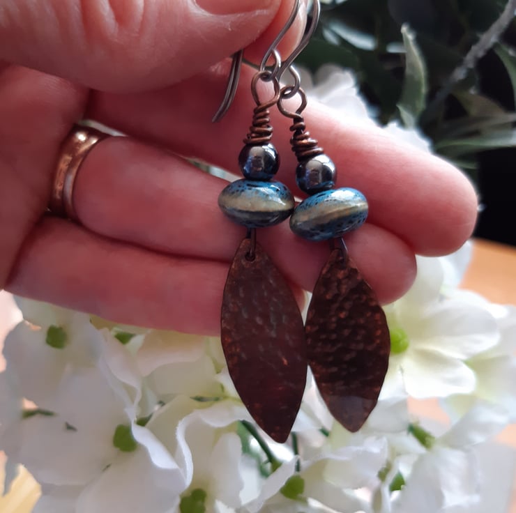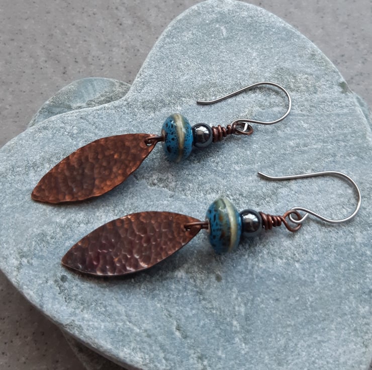 The copper shapes have then been attached to niobium ear wires which are hypoallergenic with copper wire blue ceramic beads and haematite semi precious gemstones
